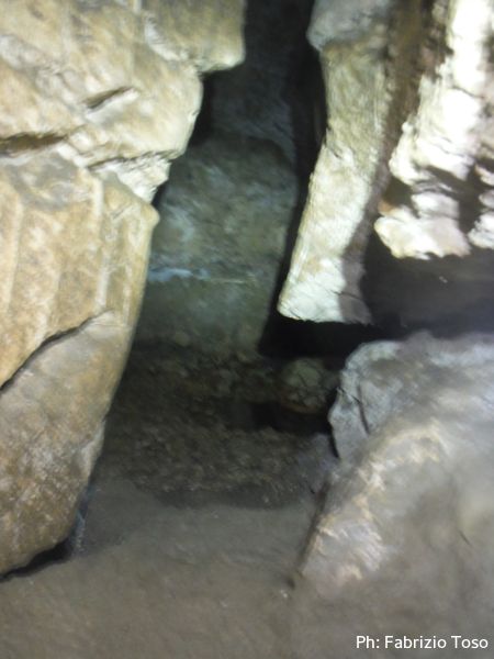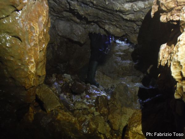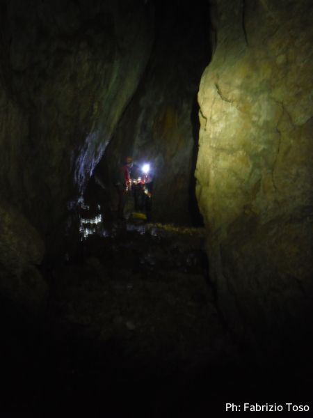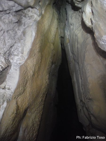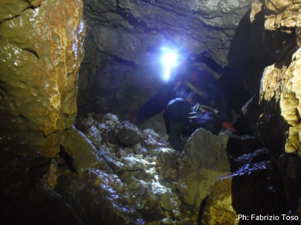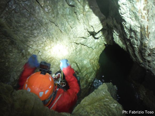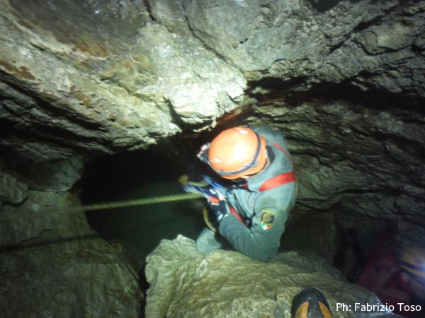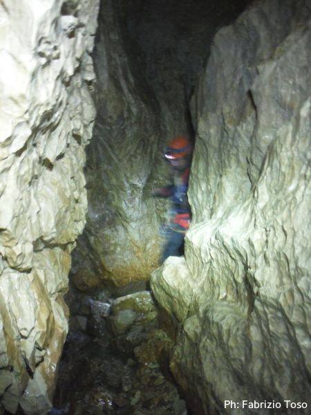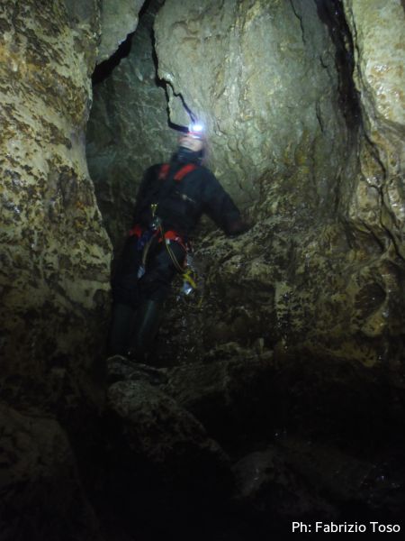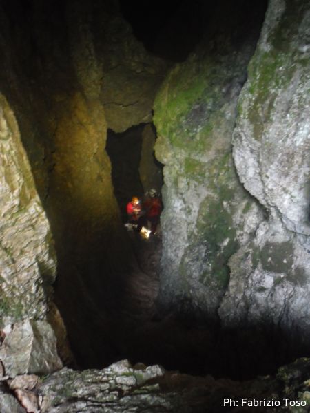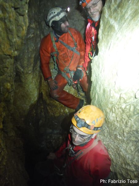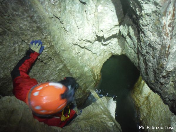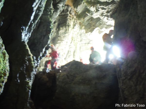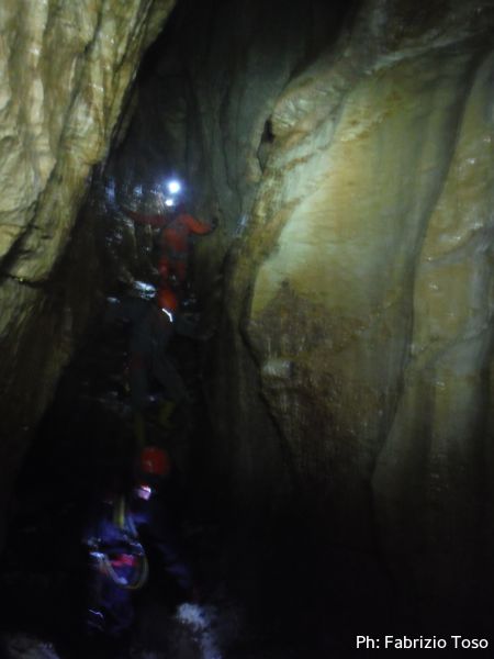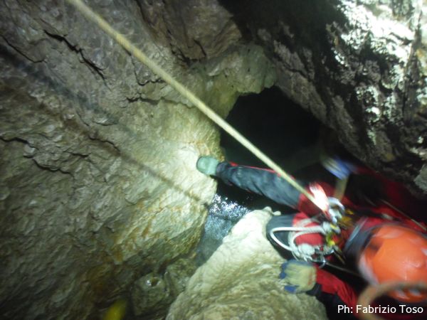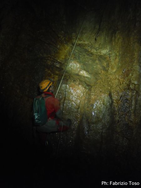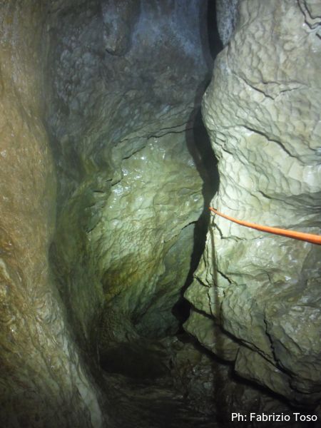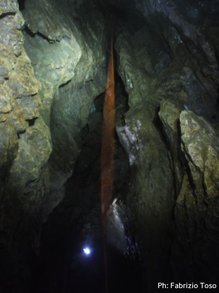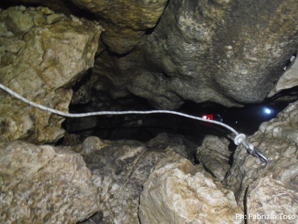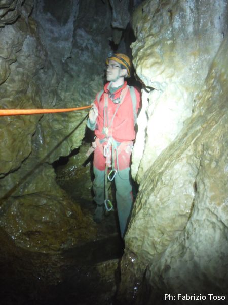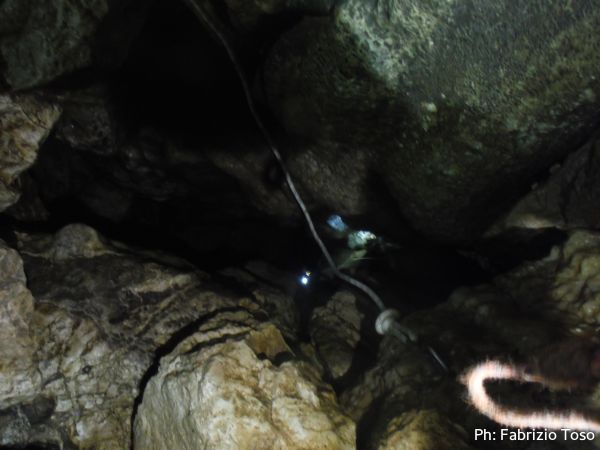 Inizio a cercare un punto dove ancorare la corda prima di trascinare quel che resta di lei all’altro salto. Nel frattempo dal pozzo parallelo iniziano ad arrivare altri amici.