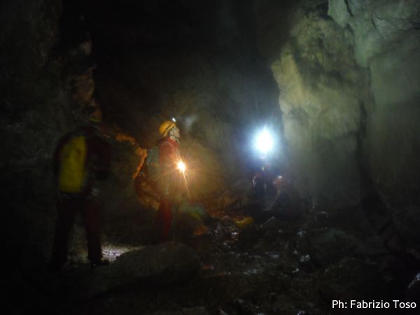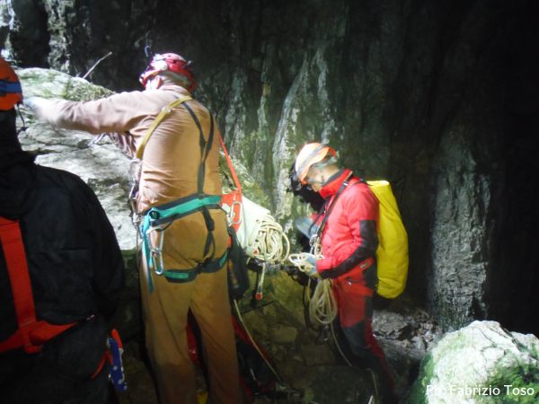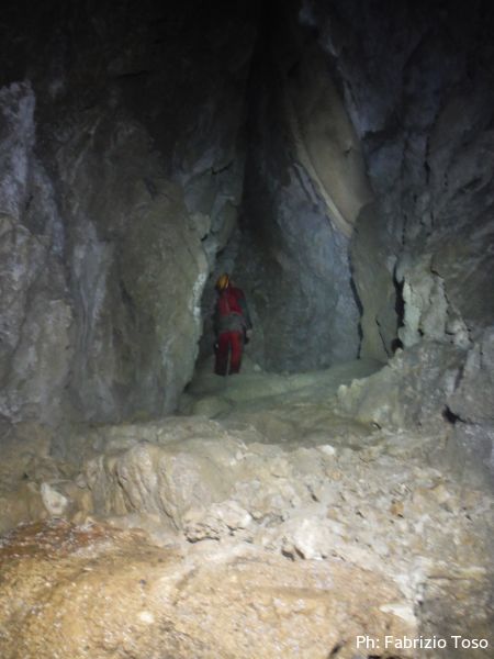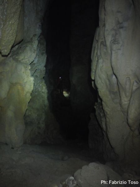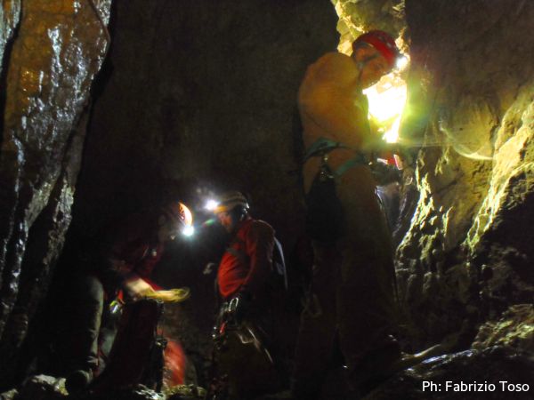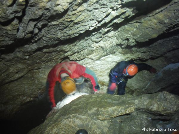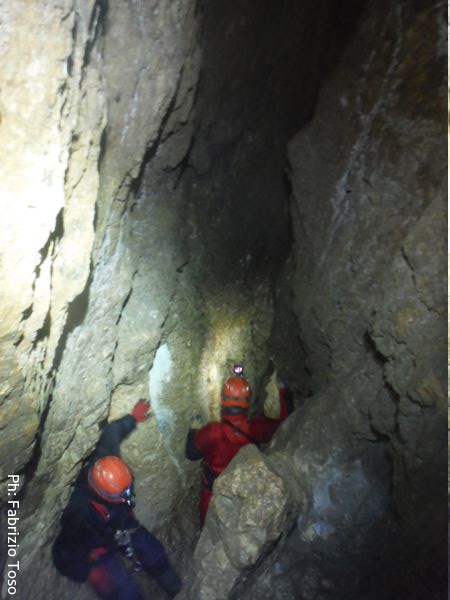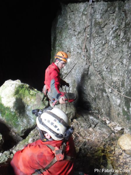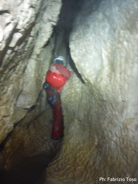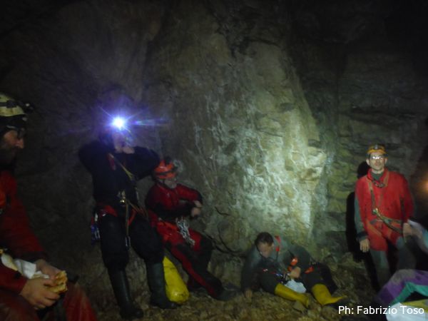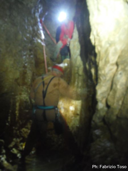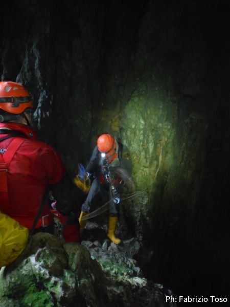 Tra i primi a scendere con me ci sono Giuseppe, Riccardo e alcuni altri amici. Giuseppe ed io ci incarichiamo di armare la parete a destra, Riccardo quella a sinistra. Procediamo svelti ed in pochi minuti siamo al secondo saltino, quello che affaccia sulla sala.