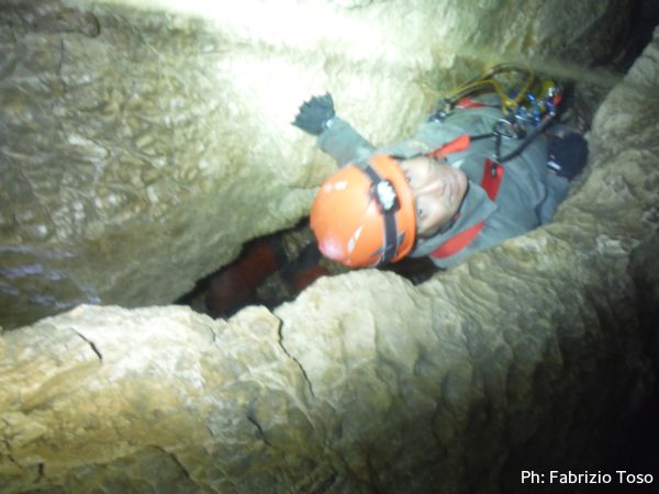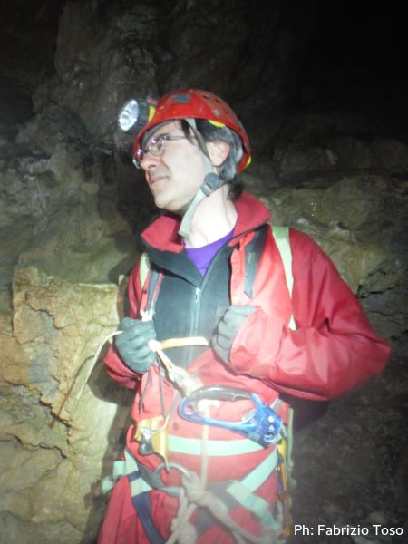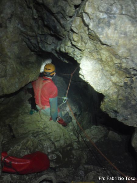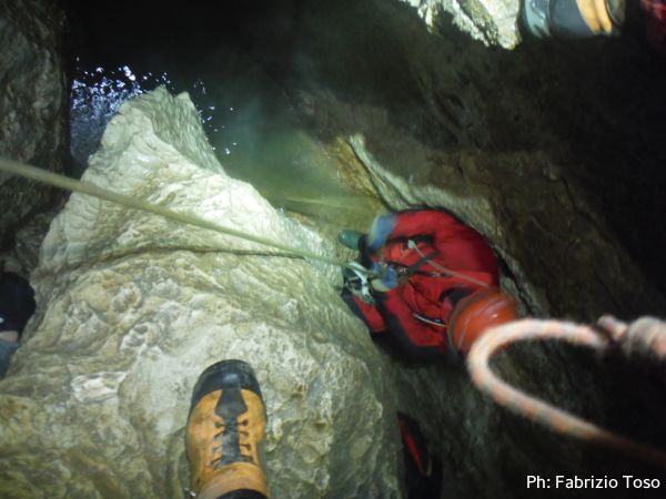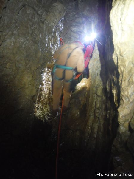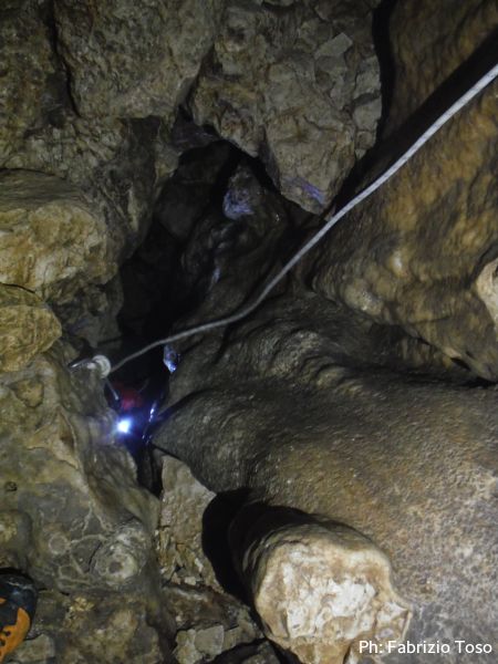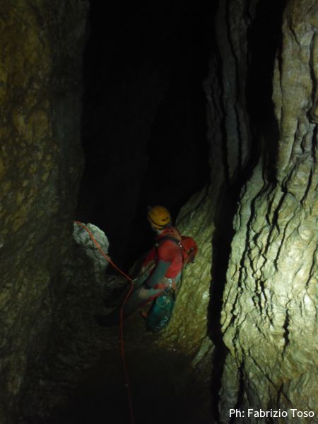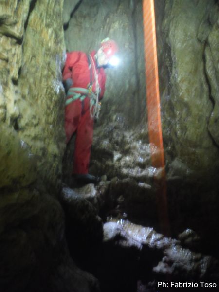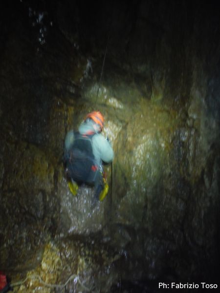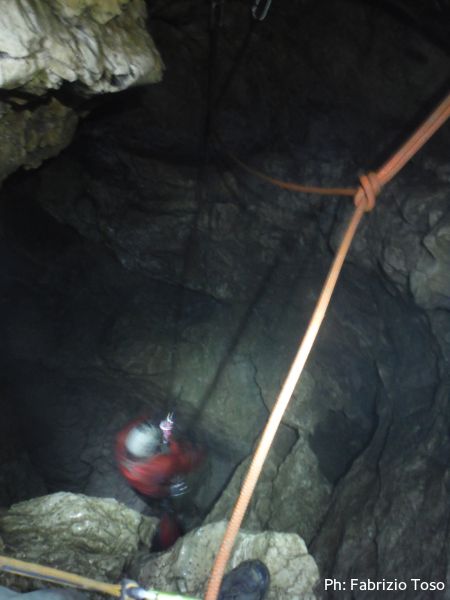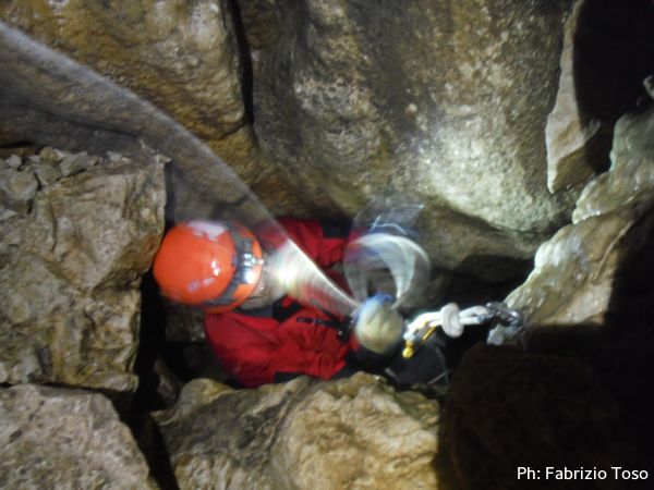 In effetti e’ meglio allungarlo un poco. Lancio un urlo a Giuseppe dicendogli di aggiungere un moschettone, dovrebbe bastare. Domenico nel frattempo e’ sceso per l’altro pozzo e mi raggiunge.