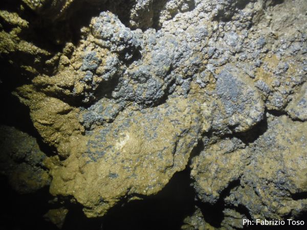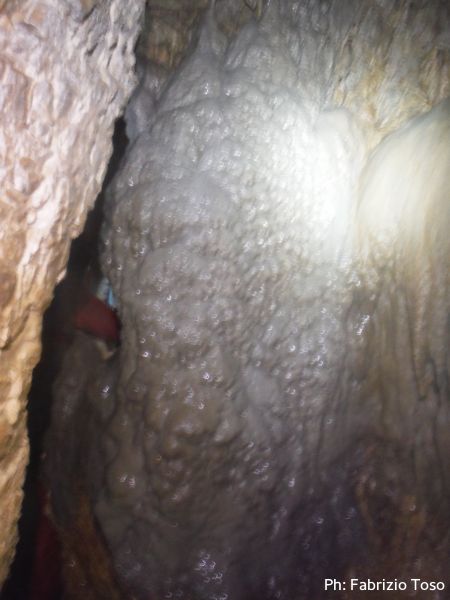 Mentre aspetto che il gruppo si ricompatti per scendere assieme il meandro, vago in giro per la sala a cercare spunti per qualche foto. Ne trovo uno in queste escrescenze grigie. Mi limito a ritrarle senza investigare oltre.