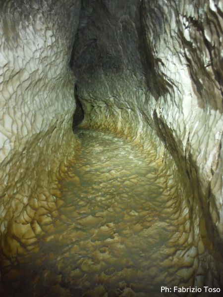 La prima pozza d’acqua la passiamo tutti con qualche agile passaggio, non crea problema a nessuno. La seconda sembra piu’ temibile. Passo per primo e vado avanti i pochi metri che mancano per un affaccio al Marilu’. Come pensavo c’e’ troppa acqua per scenderlo. Quando torno indietro trovo i nostri amici che non osano tentare il passaggio in arrrampicata. Per fortuna il caparbio Gabriele ha portato la corda! Salgo su di un paio di metri dove trovo dei fix e sistemo la corda per agevolare il passaggio dei nostri amici.