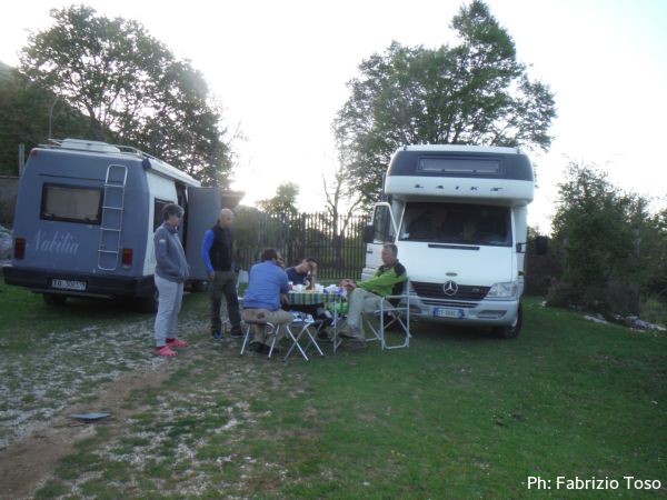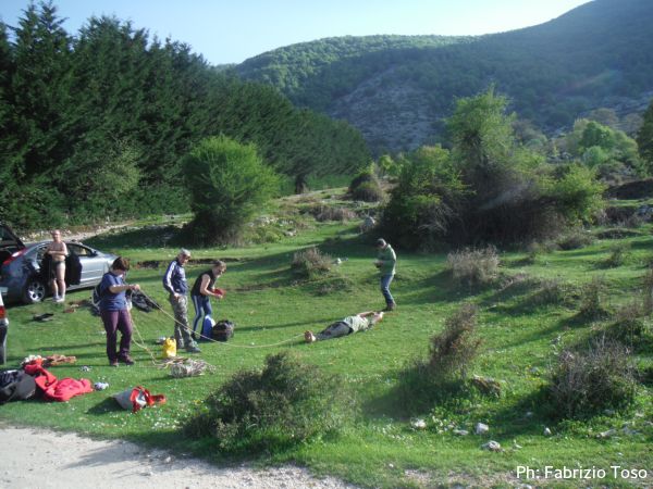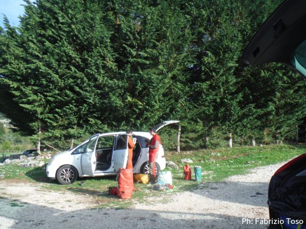 Prima di prepararci ci prendiamo il tempo per i saluti, sentire come sono organizzati e qualche chiacchiera speleo. Sul posto troviamo anche il buon Vincenzone.