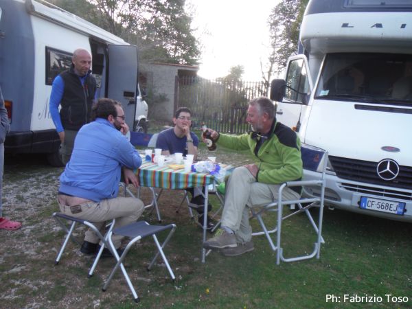 Dopo esserci messi in abiti comodi, asciutti e puliti andiamo a salutare il gruppo. Purtroppo nessuno di loro puo’ fermarsi per cena. Faremo la prossima. Dopo la loro partenza rimaniamo col problema di come occupare l’oretta che ci separa dalla cena. E’ Luca a risolverci brillantemente il problema con un aperitivo a base di birra e olive.