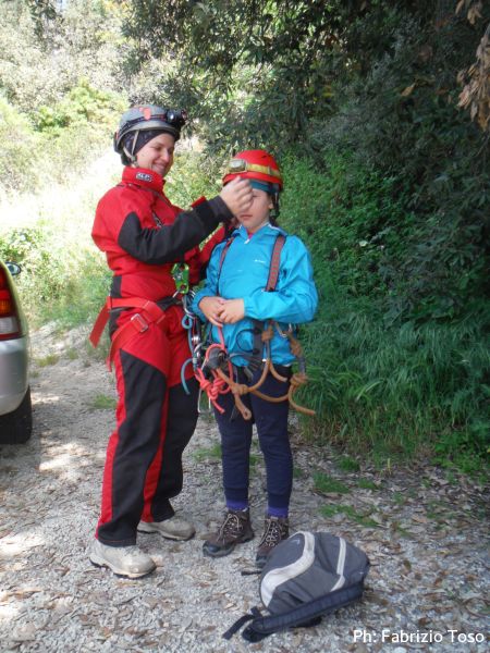 Il secondo toboga lo passiamo in maniera spartana, io lungo il toboga a fare da tappo, Giada subito dopo calata da Ginevra che manovra la corda da sopra. Arrivati alla base, aspettiamo gli altri. Nell’attesa presento a Giada i “broccoletti”, in questo punto ce ne sono parecchi, e condisco il tutto con un nuovo episodio inedito delle avventure della piccola Gi’.