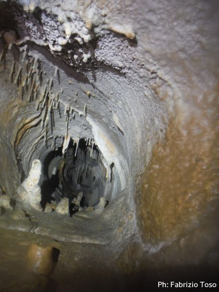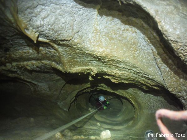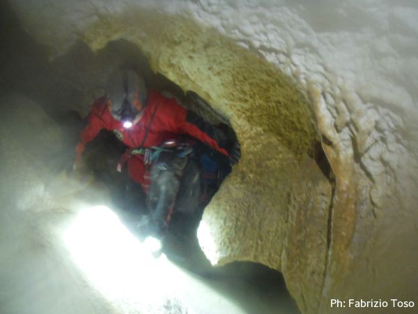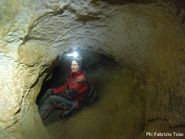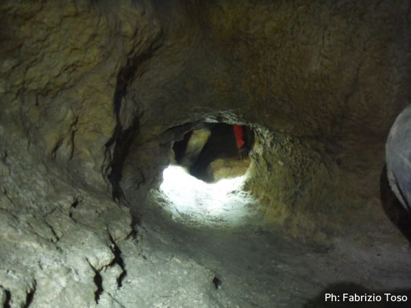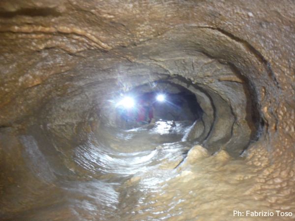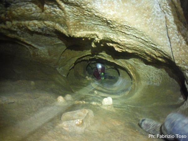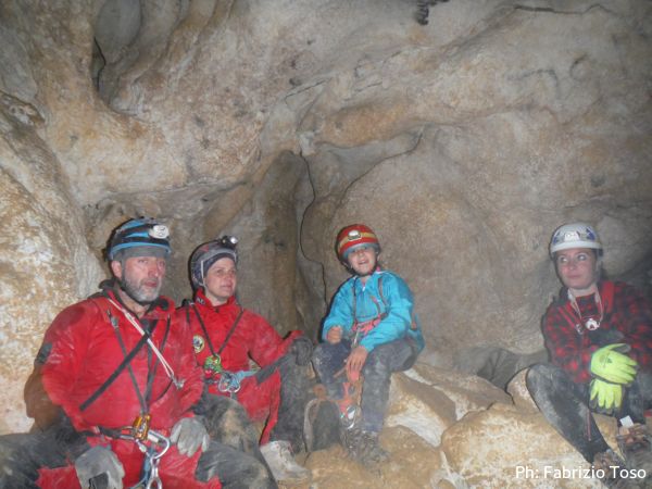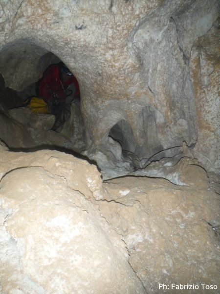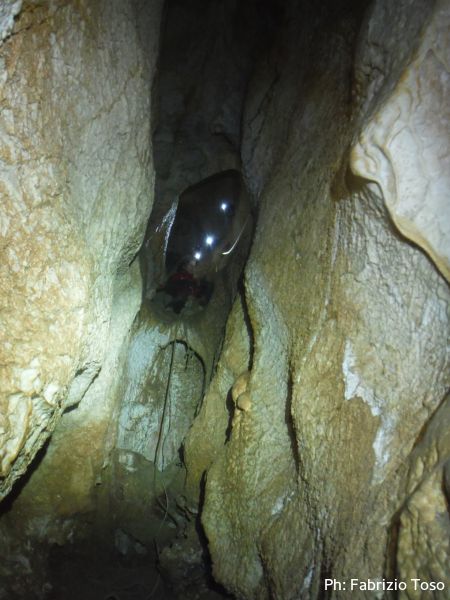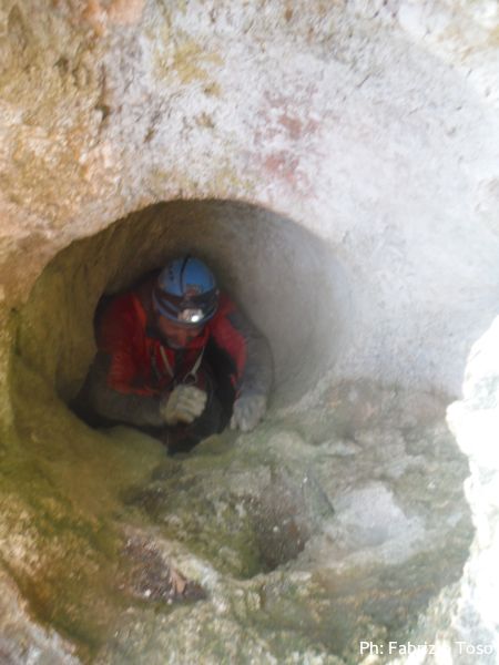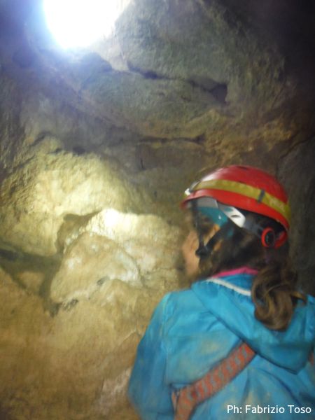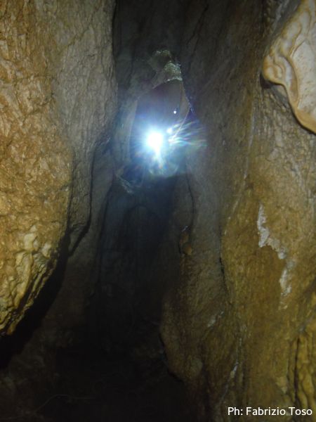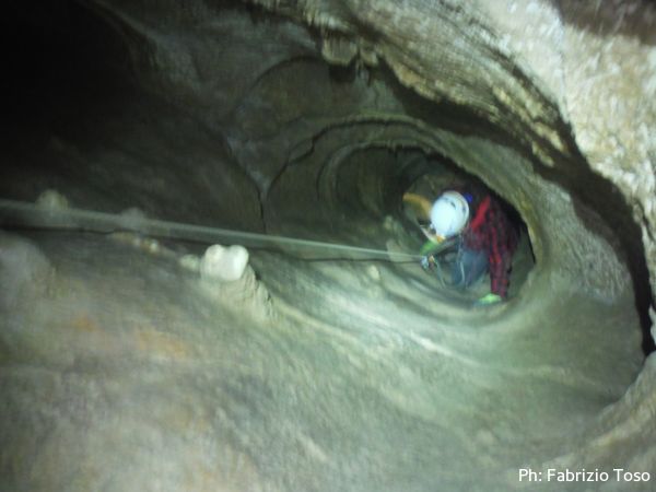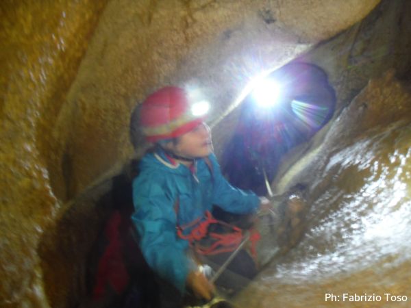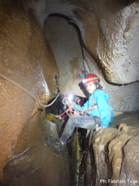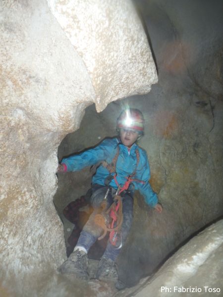 Al primo toboga scendo ed aspetto l’arrivo di Giada, calata da Giuseppe con la corda. Questo passaggio pare andare senza problemi, anzi, ora Giada mi sembra piu’ tranquilla. Mentre la aspetto scatto una foto al solito cunicolo laterale, come faccio ad ogni uscita.