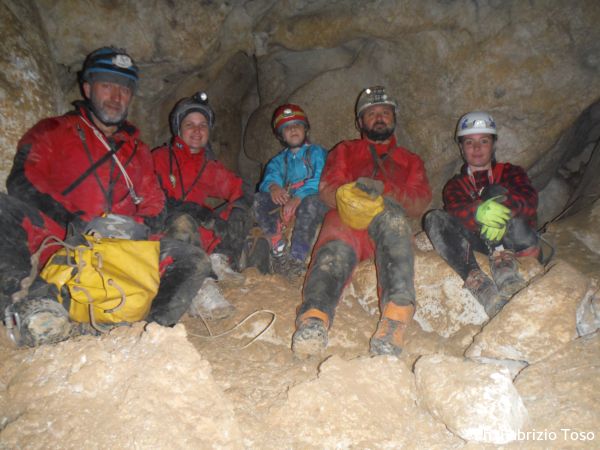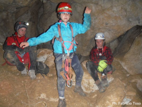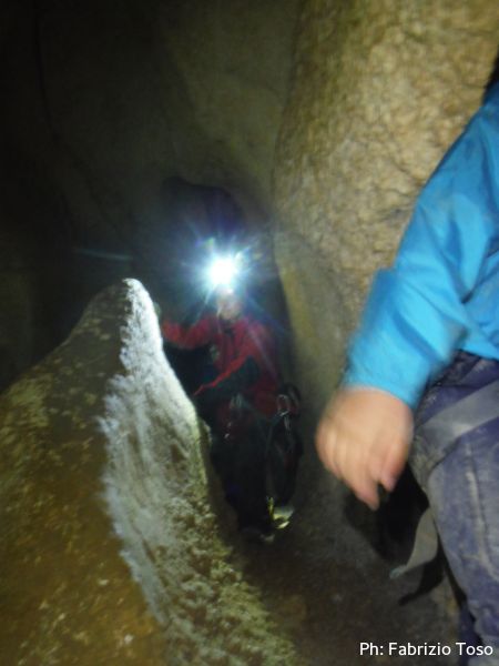 Al passaggio basso, mi rifiuto di chiamarlo strettoia, tantomeno per Giada, la sua determinazione ha di nuovo un calo. Stavolta passo io poi la aiuto a passare a sua volta quasi tirandola di peso. Il metodo spiccio non le piace molto e continua a proclamare a gran voce di voler uscire. Nemmeno il sopraggiungere di Barbara sembra ridarle fiducia. Per distrarla un poco inizio a raccontarle una storia di fantasia basata su Ginevra. Mi invento che quando conobbi Ginevra, lei era piccina, talmente piccola che potevo tenerla tutta in una mano, per l’occasione ribattezzo Ginevra come “piccola Gi'”. La storia fa ridere tutto il gruppo e quasi strappa un sorriso anche a Giada. Ora sembra che possiamo andare avanti.