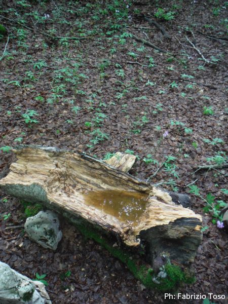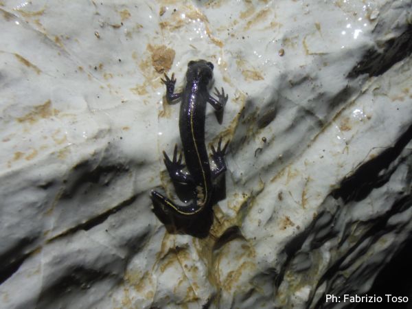 Quando lo stillicidio inizia a diventare piu’ fastidioso, c’e’ il frazionamento spostato dalla verticale che risolve un poco, ma non troppo. Piu’ si scende e piu’ lo stillicidio diventa intenso. Arrivo alla cengia dove, in prossimita’ del deviatore, c’e’ la lesione alla corda . Mi metto comodo poi osservo la corda, la calza e’ troppo rovinata, non c’e’ altra scelta se non tagliarla e giuntarla ad un nuovo frazionamento. Mentre faccio queste considerazioni sono in piedi sulla cengia. Inizio a guardarmi intorno per cercare un buon punto dove frazionare. Guardo anche verso il basso perche’ ho notato un sasso strano. Caspita! Non e’ un sasso. E’ uno strano animaletto nero, una salamandra, penso. Provo a toccarlo ma quasi non reagisce. E’ un animale di superficie, probabilmente qua morira’. Verifico tra me se posso portarlo fuori. Purtroppo non ho un contenitore rigido dove metterlo. Nel taschino della tuta lo schiaccerei e lo stesso sarebbe se lo mettessi nello zaino. Non potendo fare altro lo sposto di lato almeno evitero’ di calpestarlo durante le mie manovre.