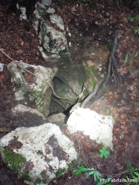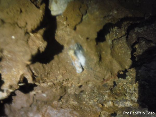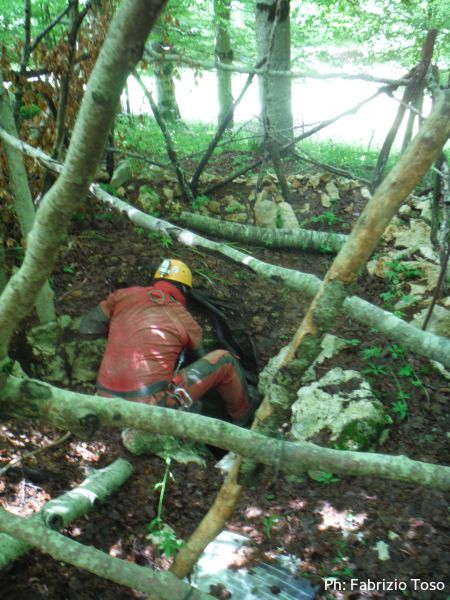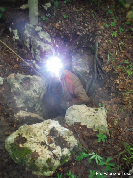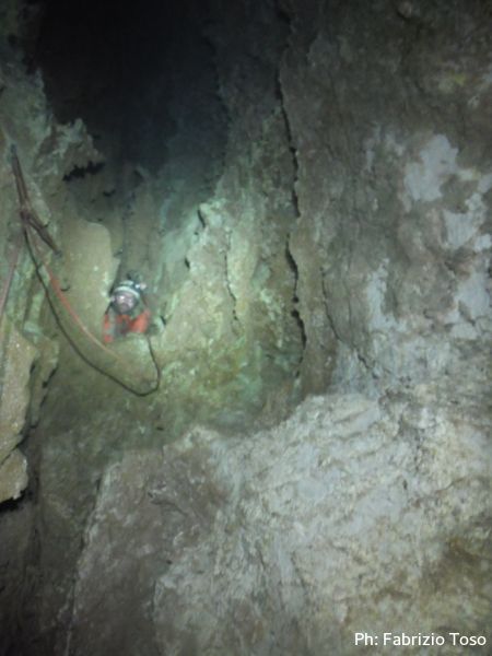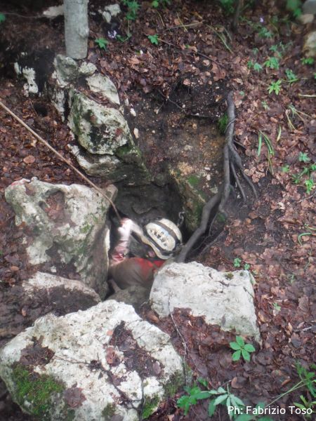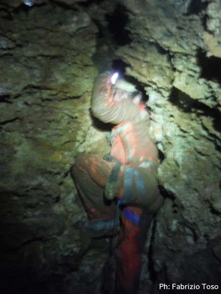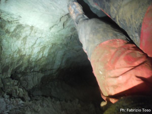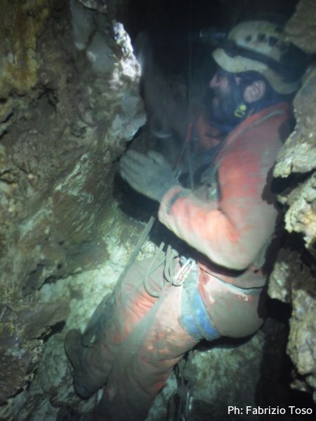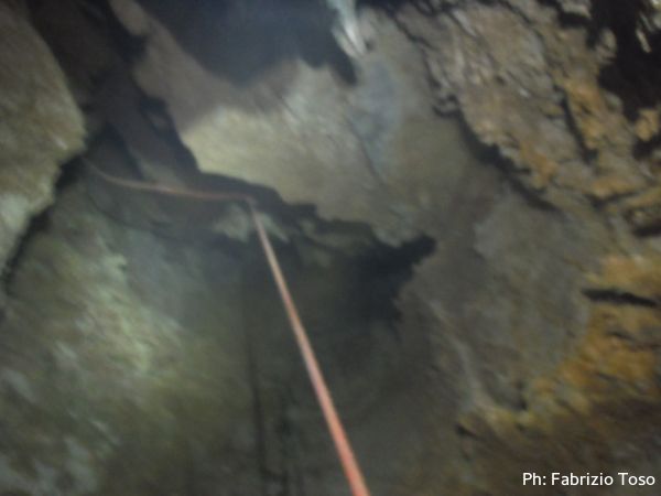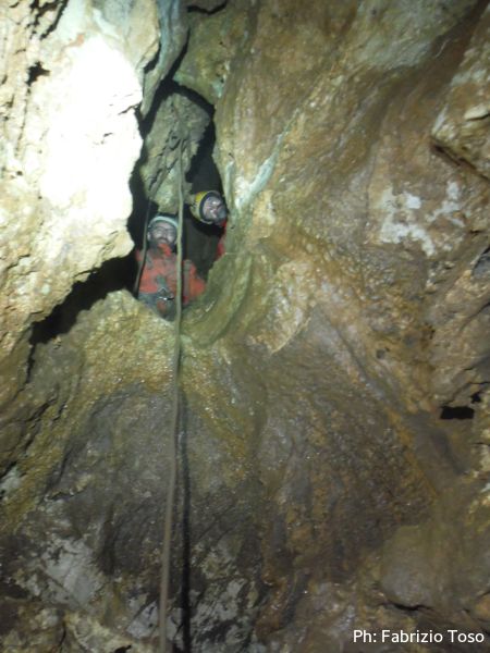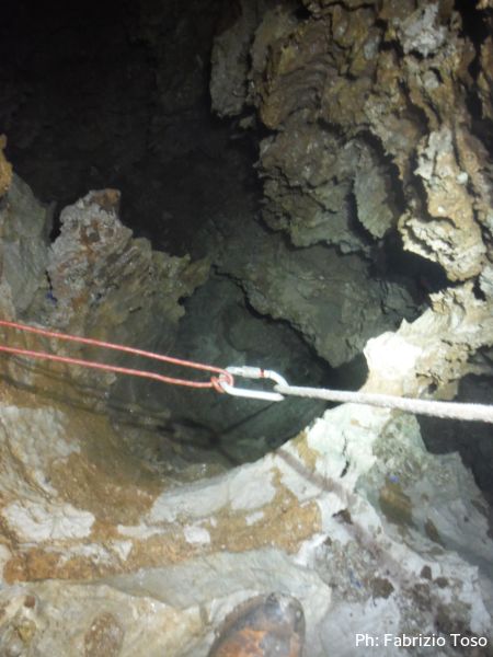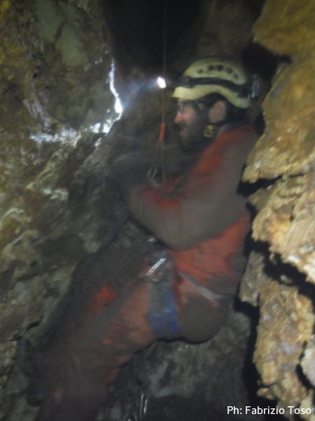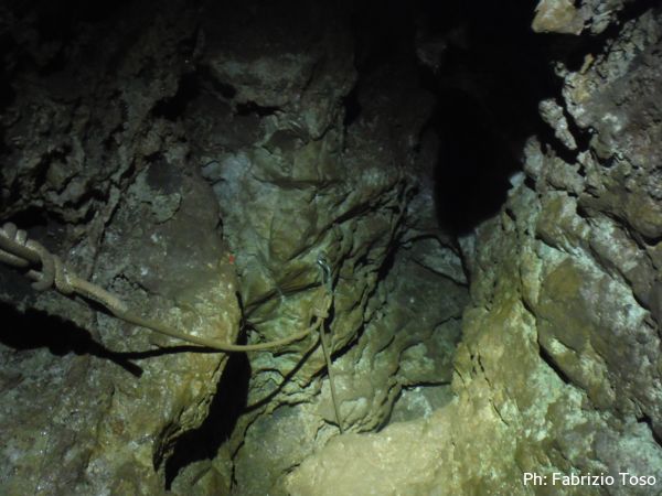 Dopo l’armo cedono a me l’onore di scendere per primo. La corda si rivela comoda, non tanto per il saltino iniziale, quanto per lo scivolo successivo che e’ diventato alquanto ripido e scivoloso. Quando Gabriele mi raggiunge, sono impegnato a sondare un arrivo che si vede in alto quando ci si infila nel pozzo. Inizio a smartellare per creare lo spazio e poter guardare meglio. Ho allargato un poco ed invito Gabriele a dare anche lui un’occhiata mentre aspettiamo che scenda anche Maurizio. Dopo aver valutato la cosa assieme decidiamo che con ottima probabilita’ e’ un budello stretto che porta anche lui alla sala alla base del pozzo. Gabriele che e’ gia’ pronto, inizia a scendere il pozzo mentre il buon Maurizio fa la sua comparizione. Nel fare spazio per vedere il buco ho notato alcune rocce che, se rimosse, renderebbero piu’ agevole (ovvero “marionabile”) l’uscita dal pozzo. Farebbe comodo il piede di porco. Maurizio dice di averne uno in macchina e si offre di andarlo a prendere. Mentre lo aspetto, inizio a martellare la roccia con metodo ed energia riuscendo a togliere qualche pezzo di roccia. Con il ritorno di Maurizio e l’arrivo dello strumento acconcio, diamo una nuova forma all’imbocco del pozzo. Non si puo’ dire che sia largo, pero’ ora si puo’ entrare ed uscire senza doversi divincolare troppo. Alla saletta successiva ci ritroviamo tutti e 3 assieme. Perdo, o meglio, impiego ancora qualche minuto a rendere piu’ comodo l’armo del saltino da 2 metri che segue. Anche lui ha una partenza che diventa antipatica quando si affronta al ritorno. Dopo averlo sistemato meglio di prima, continuo a scendere per primo. Da sotto faccio una foto di saluto a Maurizio, ha deciso che per lui oggi basta cosi’, non entrava in grotta da parecchio e non vuole forzare. Gabriele scende mentre mi muovo per andare al pozzo successivo, il P25.