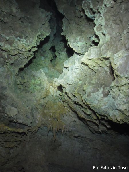 Sono stato poco attivo in questo ultimo periodo per un guaio al ginocchio e, anche se oggi non ho fatto molto, la salita la sento. Quando sono in vista del frazionamento iniziale mi prendo del tempo per fare qualche foto ai veli di concrezione che abbracciano la roccia. Sono tanto fragili da rompersi al minimo contatto.