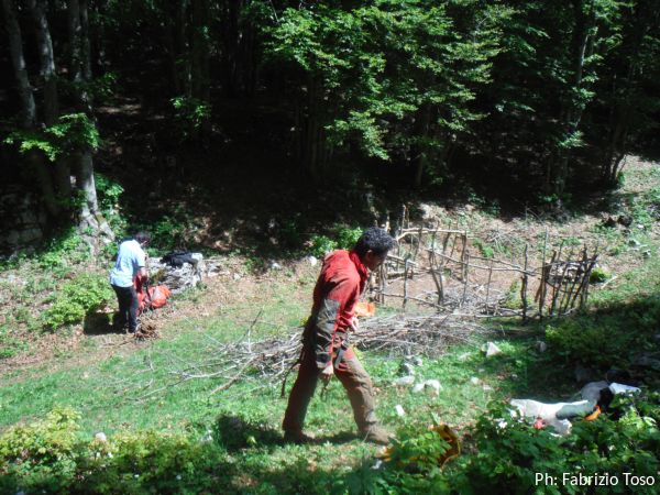 Come oramai di consueto ci diamo appuntamento alle 8.30 sotto casa mia. Quando Gabriele arriva, Giuseppe ed io stiamo aspettandolo godendoci placido il sole del mattino. Gabriele arriva con una gradita sorpresa, oggi si e’ unito a noi anche Daniele. Dopo aver caricato gli zaini, partiamo. Facciamo una sosta “tecnica” al bar da Cicchetti per la colazione e poi su a Campo dell’Osso. Parcheggiamo in uno spiazzo nei pressi della grotta dove troviamo Maurizio che ci attende. Pochi passi e siamo davanti alla grotta dove posso ammirare il nuovo recinto di “filagne” opera di mastro Nerone.