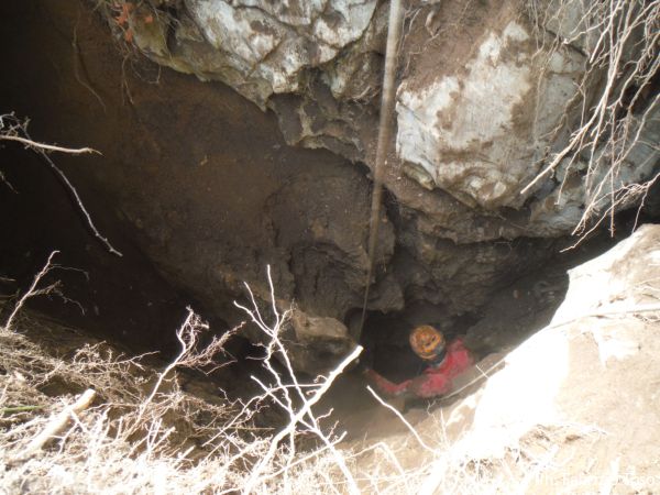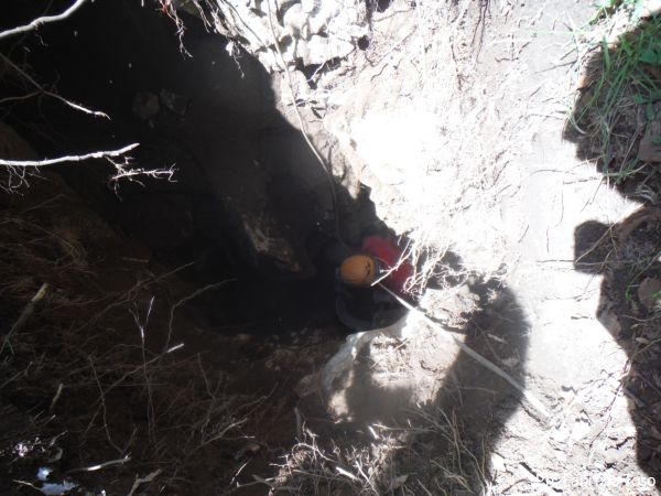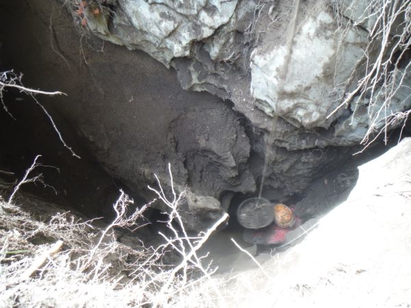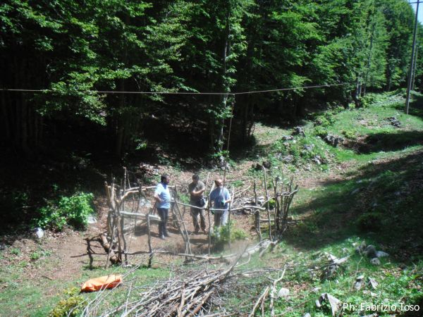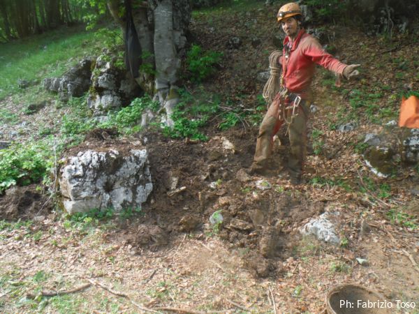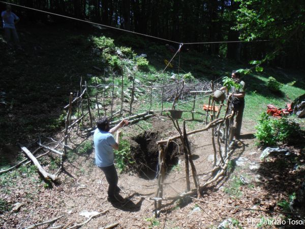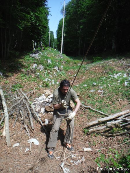 Ci sono sassi grandi da tirare fuori. Dobbiamo approntare una corda tesa per attaccarci una carrucola sulla verticale del buco. Per fortuna le corde e gli alberi per attaccarle non ci mancano. Daniele da una parte ed io dall’altra, prendiamo gli alberi piu’ consoni a far passare la corda in corrispondenza del centro del buco.