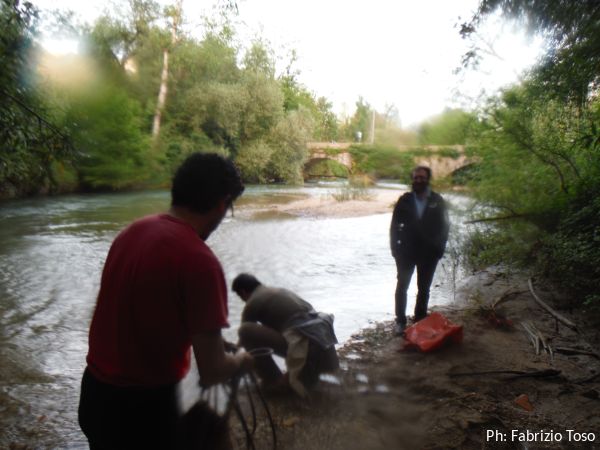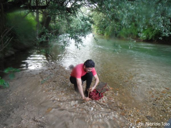 Riposto tutto nei sacchi siamo pronti a muoverci. Tra un secchio e l’altro si e’ fatta ora di cena. Salutiamo Maurizio che rimane a Livata a passare il fine settimana e noi “romani” ci dirigiamo a Marano Equo per delle meritatissime fettuccine. Strada facendo, quando incrociamo l’Aniene, facciamo sosta per togliere il grosso del fango dalla tuta, le attrezzature e le corde.