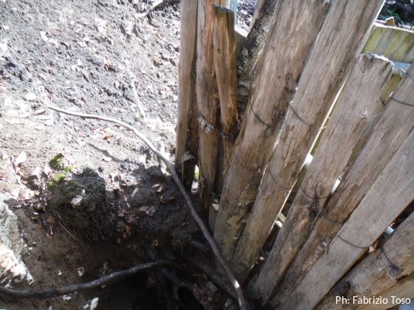 Un lavoro enorme per contenere la terra, pero’ di lato alla gabbia l’acqua pare abbia trovato un’altra via. Ci segniamo mentalmente di tornare.