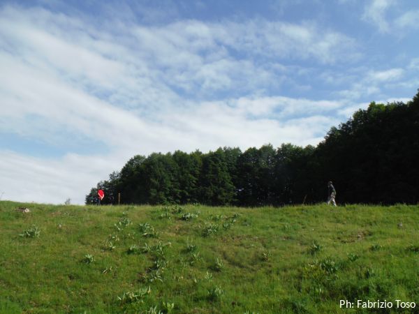Lentamente ci allontaniamo dalla strada, Gabriele ha una segnalazione da controllare. Siamo alla pista degli slittini ed il buco segnalato dovrebbe essere in cima, a bordo pista.