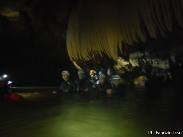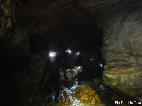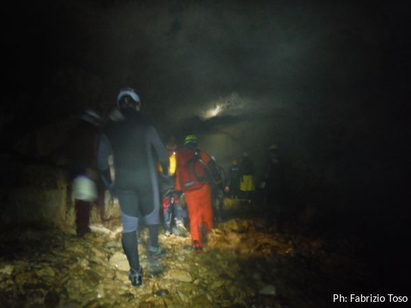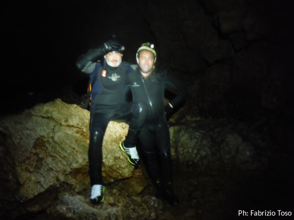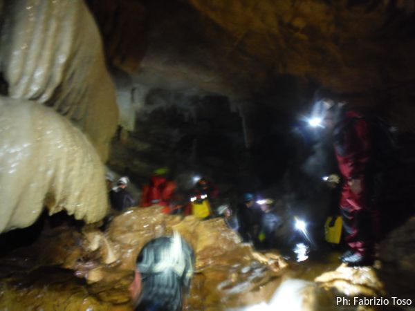 Mentre mi vesto cercando di non sciogliermi, il posto si popola. Ci sono tanti ex-allievi dell’ultimo corso SCR, li rivedo volentieri…anche se parecchia acqua dovra’ passare per la grotta prima che ne ricordi i nomi.