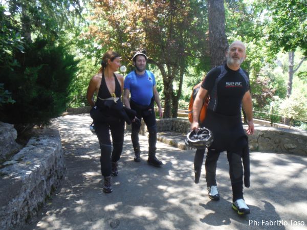 Saluti e chiacchiere mi prendono parecchio tempo pero’ finche’ non ho la muta addosso va tutto bene. Fa caldo. Decido che mi vestiro’ vicino all’acqua cosi’ da potermi immergere subito e limitare il sudore. Sistemo lo zaino da forra con tutto quello che mi servira’ in grotta e mi avvio dopo aver avvisato delle mie intenzioni. Linda si aggrega. All’ingresso, quello basso, dove solitamente parte la traversata, trovo Stefano con il suo “nipotino”, buon sangue non mente, e’ alto quasi piu’ di lui.