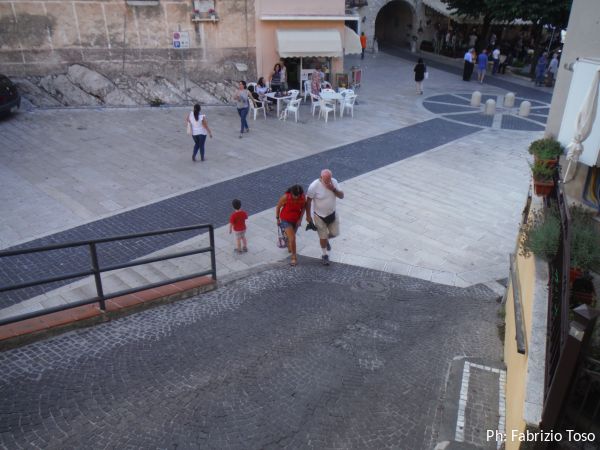 Gabriele ed io terminiamo con calma e come si deve il pranzo ma poi dobbiamo scappare. La nostra nuova meta e’ Sonnino, c’e’ il convegno per mostrare al mondo le scoperte archeologiche fatte alla vicina grotta “la Sassa”. Parcheggiamo dove ci dice il navigatore. Dice che siamo vicini al punto dove si tiene il convegno, pero’ tace sul fatto che per arrivarci dobbiamo superare un invidiabile dislivello. Quello che ci vuole per smaltire il pranzo.