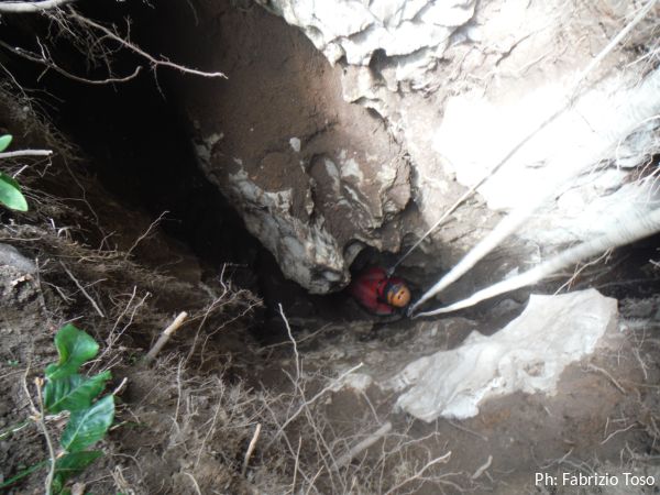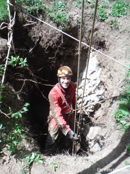 Valerio ha trovato una possibile prosecuzione, e’ eccitatissimo ed inizia ad urlare “Pozzo! Pozzo! Pozzo!”. Quando risale, ci racconta che spostando un sasso si e’ aperto un passaggio e dopo c’e’ un ambiente. Col suo inguaribile ottimismo stima di aver trovato almeno un pozzo da 10 metri.