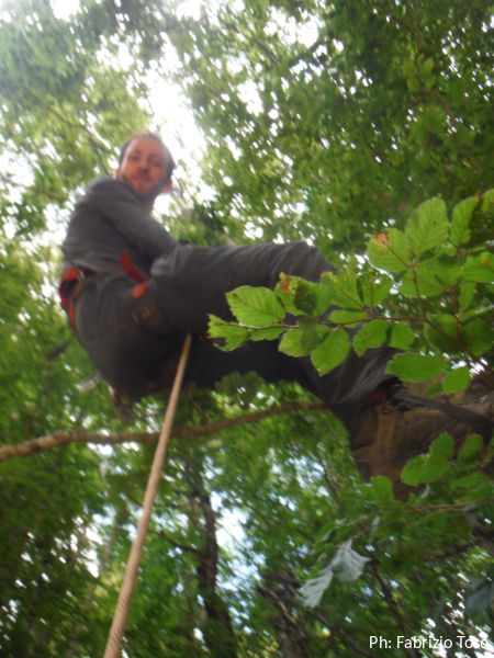 Nonostante il pozzo trovato da Valerio, il lavoro da fare rimane tanto. Leandro ha preso commiato da un po’. Anche noi decidiamo che per oggi abbiamo fatto abbastanza. Iniziamo a sistemare le nostre cose. Salgo sull’albero per togliere l’armo del contrappeso.