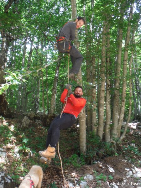 Decidiamo di tirarlo su facendo contrappeso. Giuseppe lo accompagnera’ nella salita. Ci siamo, si inizia, Gabriele controlla dall’alto e fa in maniera che il treppiede non si ribalti. Leandro ed io siamo sulla corda a fare da pesi da contrapporre al masso.