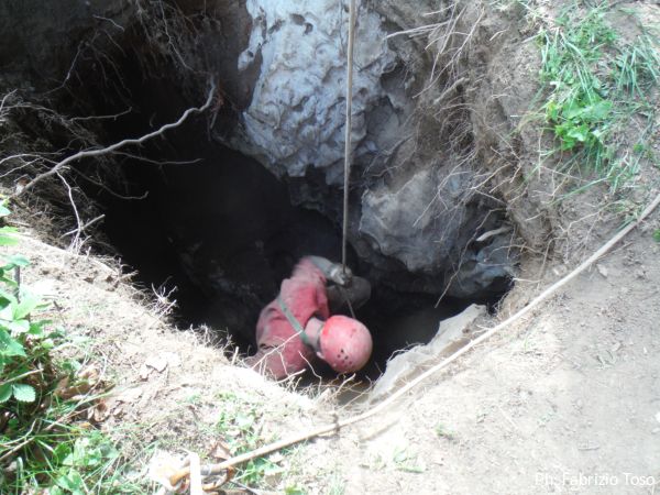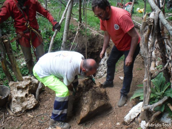 Il masso e’ arrivato oltre il bordo. Tra Maurizio,Giuseppe e Gabriele, lo portano fuori dal buco. Al loro via mi tolgo dalla corda e, con una spinta verso l’alto a Leandro, facciamo poggiare il masso a terra dove lo spostiamo in posizione sicura.