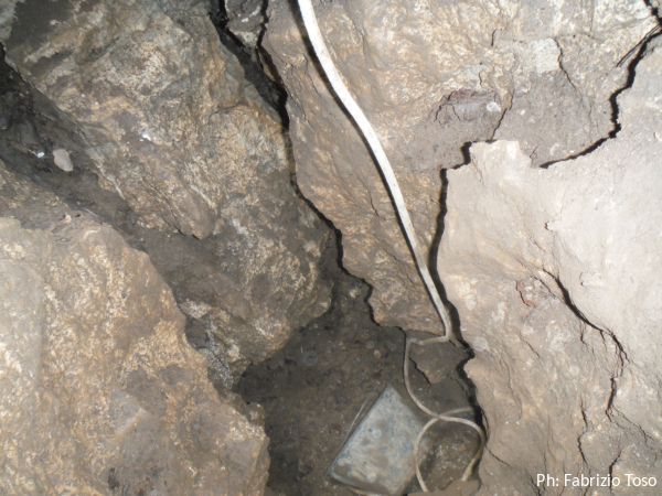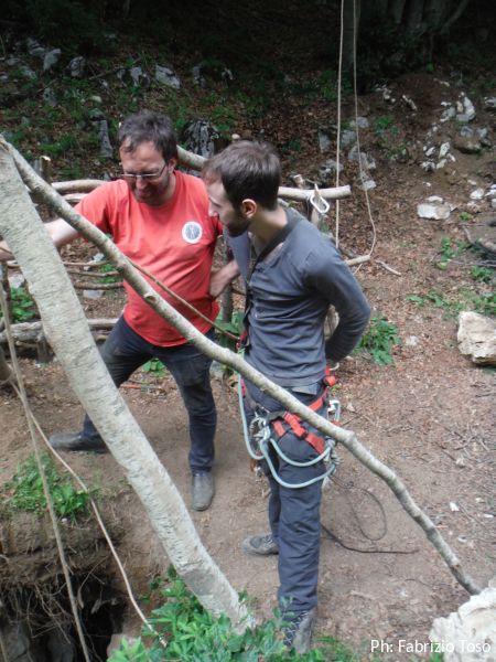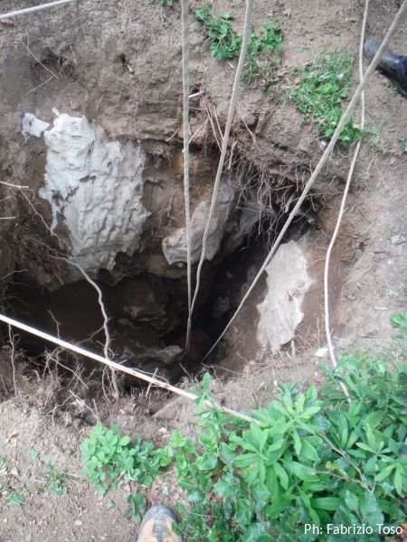 Quando arriviamo al buco che, con molto ottimismo, abbiamo nominato “Grotta Vale”, troviamo Giuseppe e Valerio che scavano di sotto.