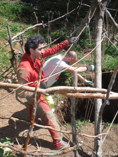 Giuseppe scende per sistemarlo a dovere, noi intanto approntiamo il necessario per tirarlo su.