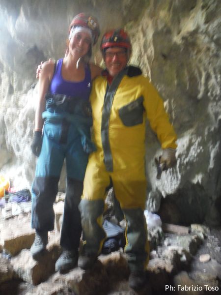 Ecco Federica e Paolo che salutano i nostri speleo-archeologi. Angelica qua e’ a casa sua e gia’ scorrazza qua e la’ per la grotta in cerca di pissidi.