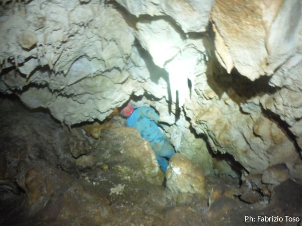 Con la scusa di portare il cavo elettrico dentro la prosecuzione della grotta, ci infiliamo nello stretto passaggio dove la grotta sembra proseguire.