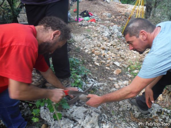 Il piccone ha il manico che sporge troppo ed e’ difficile da usare nella buca. Tra Federica, Paolo e Fabrizio si ingegnano per tagliare via il pezzo di troppo.