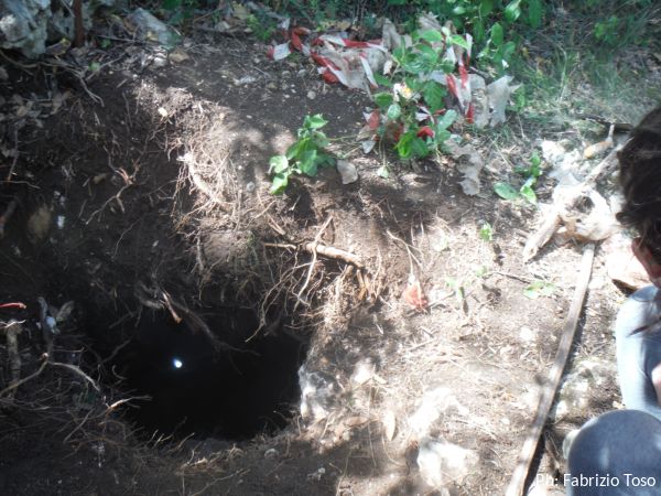 Nessuna corrente d’aria. Restituisco a Livia la sigaretta. Vado a curiosare in zona scavi. L’unica maniera per far cadere i sassi senza rischiare di uccidersi e’ lavorare da distanza di sicurezza tramite un bastone. Mi cimento per un po’ ma i sassi piu’ grandi sono solidamente incastrati. I nostri esperti, riuniti in consesso, decretano che si deve scavare da fuori. Ci spostiamo tutti all’esterno.