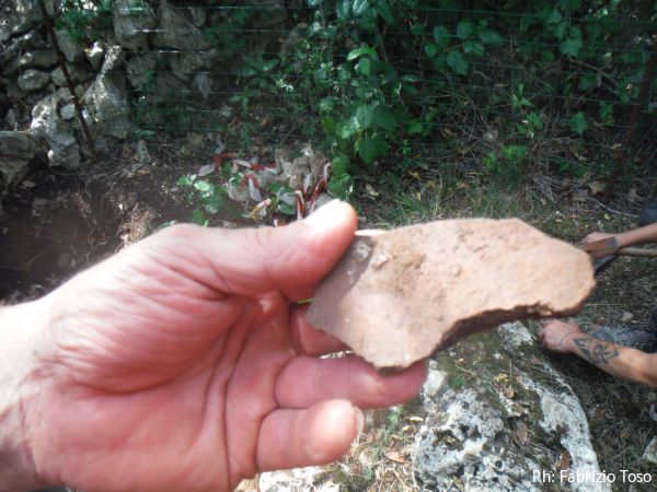 Nerone ci porge un altro coccio. Anche questo viene preso in consegna da Angelica e Luca, pare infatti essere di epoca preistorica. Loro lo vedono dal colore scuro, tipico, mi dicono, del metodo di cottura dei vasi in epoca primitiva.