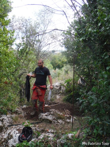 Iniziamo….La mattina affronto la traversata di Roma in metro fino ad Anagnina. Finalmente ho l’occasione di conoscere il nominatissimo “Bar Tex”, non e’ all’altezza del bar “fico” vicino Ikea, ma e’ sicuramente comodo. Dopo colazione mi assento un attimo per necessita’ e quando torno, trovo Angelica e Giulio che fanno a loro volta colazione. Dopo i saluti, qualche chiacchiera da bar, commentiamo l’assenza di Valentina, rimasta a casa per dolori vari, l’assenza di Gabriele e qualche parola sulla grotta. Finita la colazione andiamo alla macchina di Angelica e partiamo. La strada non e’ breve e dopo qualche vicoletto di campagna mi dichiaro perso. Dai cartelli sembra che siamo nei dintorni di Sonnino e non lontano dalle grotte di Pastena. Al posteggio sulla strada vicino alla grotta, ci fermiamo. Poco prima di noi sono arrivati altri amici, sono Federica e Paolo che rivedo con piacere (veramente con Federica ci si incontra nelle riunioni di FSL, pero’ incontrarsi per andare in grotta e’ molto meglio). Prendo le mie robe e vado insieme a loro verso la grotta. Siamo dentro un terreno. Probabilmente e’ un uliveto ma ora gli alberi sembrano un poco abbandonati. La grotta e’ al limitare della parte in piano del terreno, subito dopo inizia vegetazione fitta e scende dentro un profondo fosso. La grotta a prima vista sembra formata da una grande sala, si entra dal soffitto, crollato chissa’ quando.