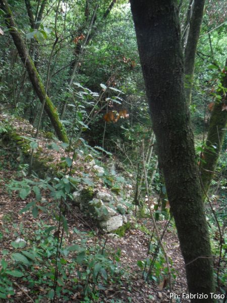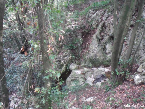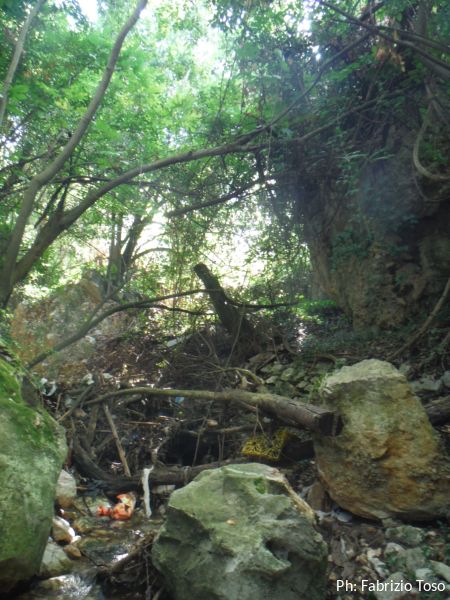 Mi inoltro verso il fosso per trovare un angolo appartato per fare un bisognino. Soddisfatto questo bisogno primario rimango a vagare per il posto, sono incuriosito. Il bordo del fosso e’ molto ripido e scende almeno una ventina di metri rispetto al’ingresso della grotta. Sotto c’e’ un fiumiciattolo. Inizio a camminare in senso inverso alla direzione di scorrimento, tenendomi qualche metro sopra il fondo del fosso.