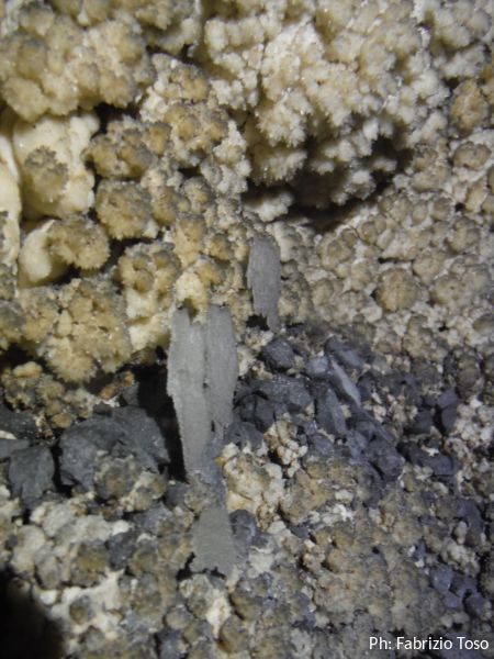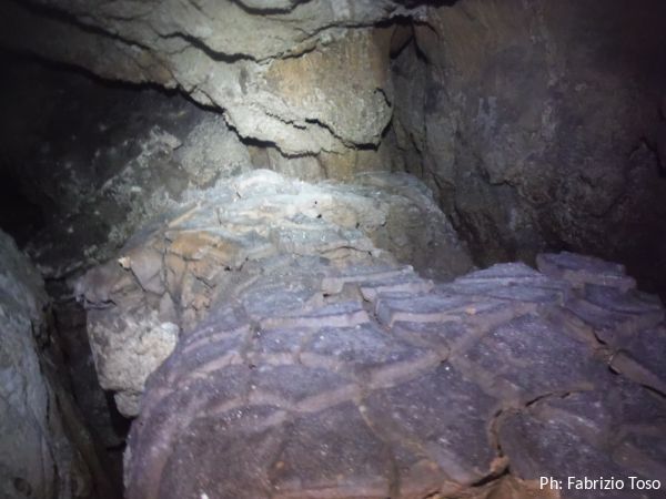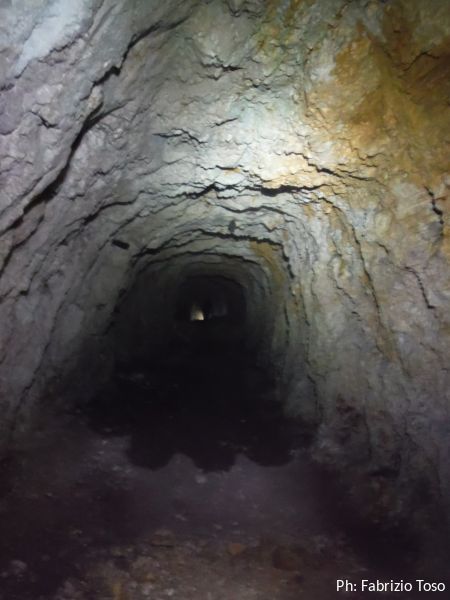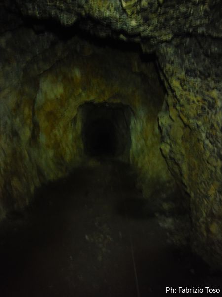 Giuseppe non ha ancora visto la restante parte della galleria artificiale. Lo accompagno nel giro. Sul soffitto trovo i resti di una mina.