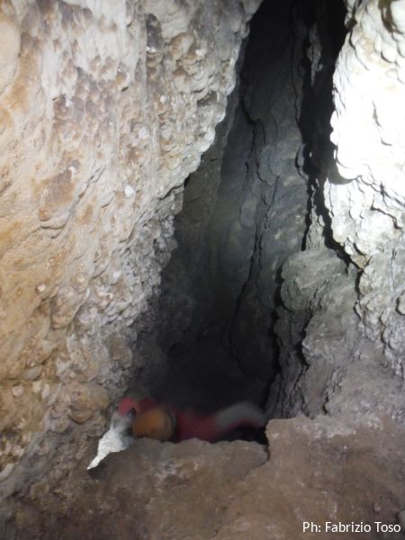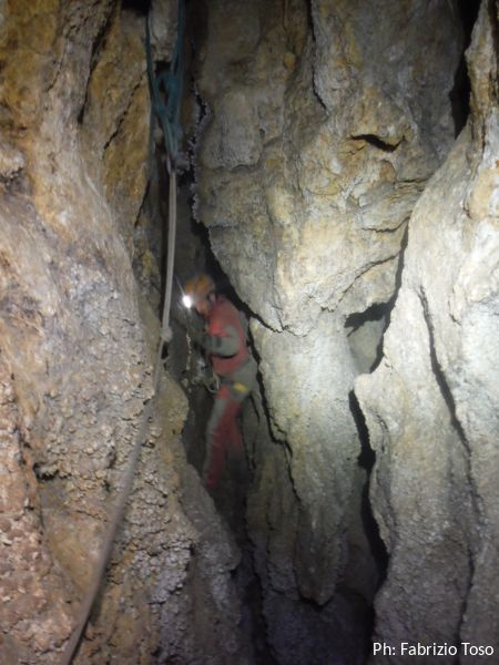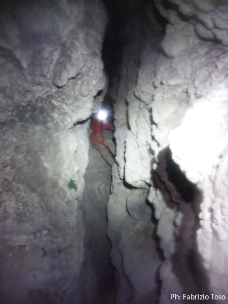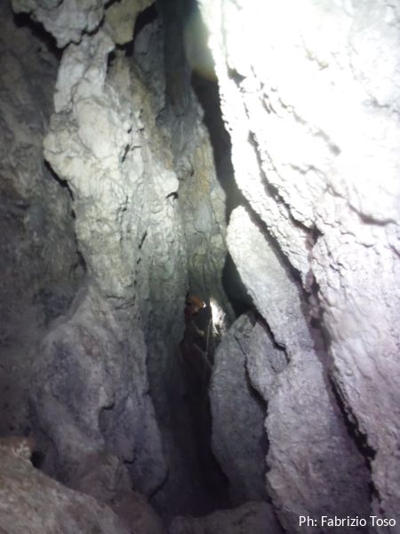 Mentre io salgo al piano di sopra, loro continuano ad esplorare la frattura nella direzione opposta al meandro. Nel salire trovo ancora un sasso di generose dimensioni che aspetta solo di cadere addosso a qualcuno. I ragazzi oramai sono lontani da me, quindi grido “Sasso!” e poi lo butto giu’. Il fragore e l’urlo devono comunque far loro impressione perche’ si levano urla di protesta. Dico loro di non preoccuparsi e di proseguire, non ci sono altri sassi in bilico.