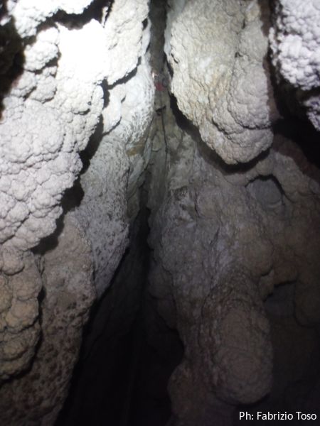 Mi siedo un paio di minuti a riprendere fiato. Sotto di me sento voci che si spostano, sembrano contenti perche’ hanno trovato delle prosecuzioni. Per ora non ho interesse a seguirli, cerco un armo naturale per riscendere. Trovo un masso abbastanza grande da poter fare da ancoraggio. Con l’aiuto di Ruggero gli passiamo intorno la corda. La passo poi di sotto nel caso i girovaghi vogliano salire. Le urla entusiastiche continuano. Con Ruggero andiamo noi verso di loro. Siamo sul pianoro visto la volta scorsa, ricordo il fix piantato sul pavimento. Su quello avevo basato la supposizione che il posto fosse gia’ stato visto. Supposizione che le urla dei ragazzi sotto di me sembrano confutare. Ora li vedo, sono circa 3 metri piu’ in basso. E’ abbastanza stretto da poter scendere in opposizione, controllo bene poi li raggiungo, Ruggero rimane su. Incontro Emanuele, e’ raggiante, hanno trovato un meandro che continua. Non ci sono segni di passaggio. Giuseppe ancora non lo vedo, e’ nei dintorni perso in questo dedalo. Seguo Emanuele.