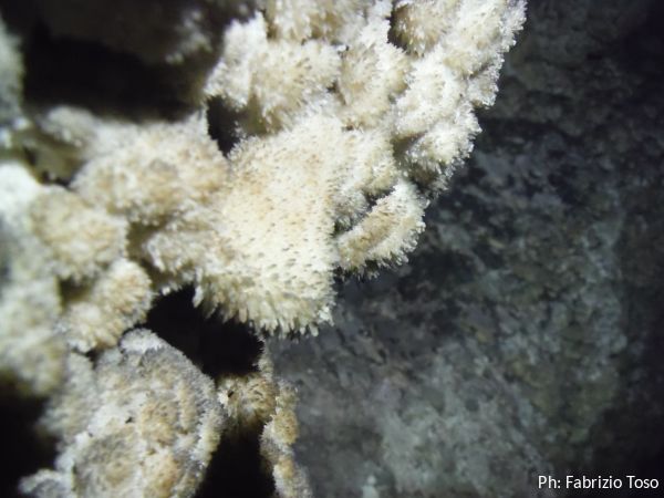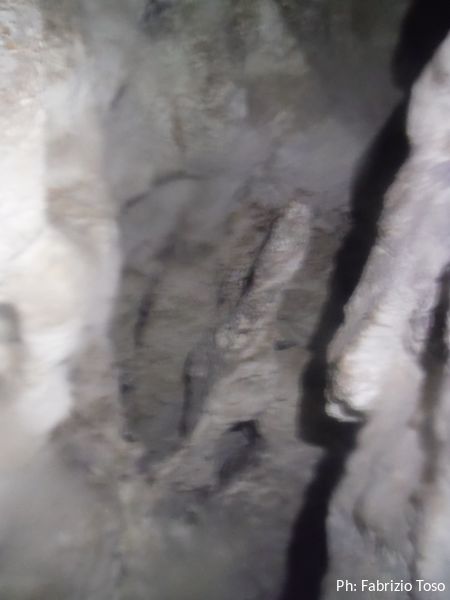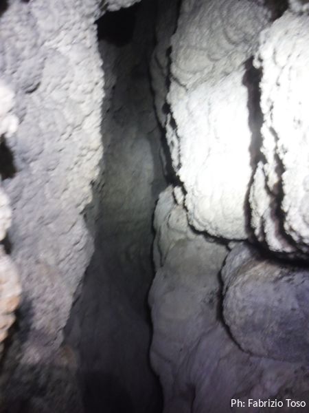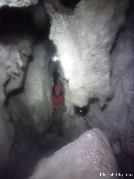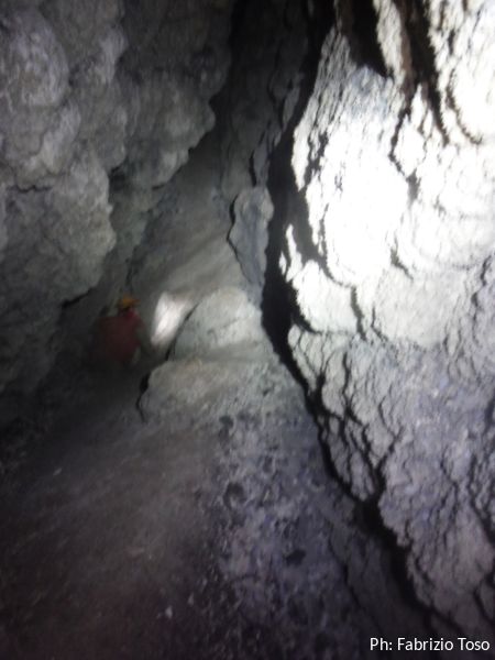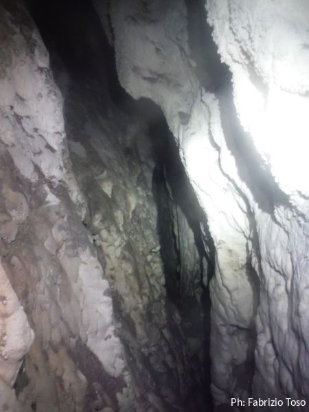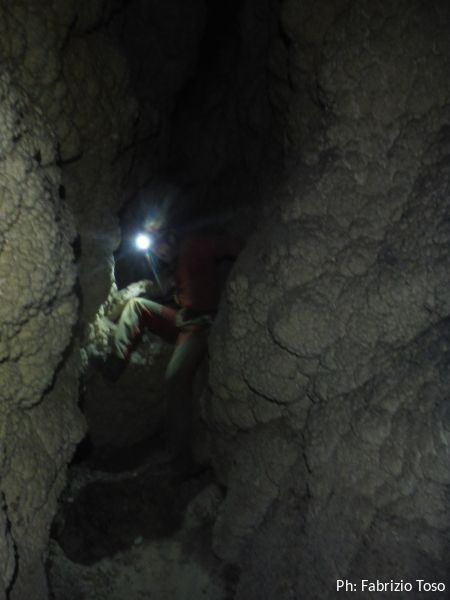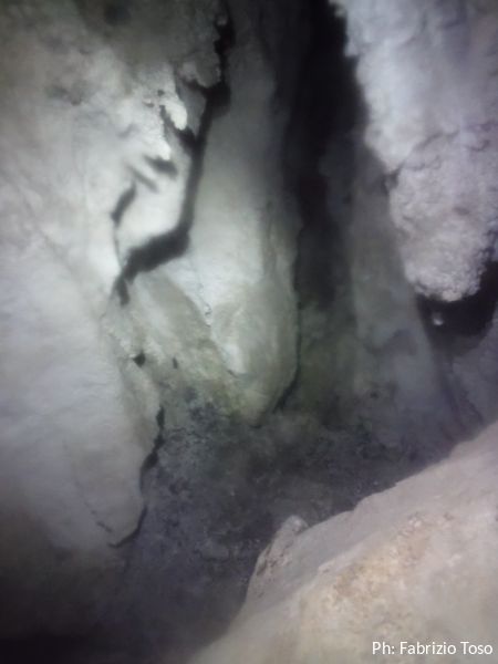 Quando siamo di nuovo assieme gli racconto di quanto ho letto sul librone riguardo la grotta. Gli spiego che da dove siamo ci sono 2 rami, uno a destra ed uno a sinistra e che sul librone veniva descritta una corrente d’aria proveniente da uno dei 2 rami. E’ stata quest’aria ad incuriosire chi, anni dopo, ha deciso di riprendere l’esplorazione della grotta. Per stimolare l’esploratore che e’ in Giuseppe, gli chiedo di dirmi da quale direzione venga l’aria. Lui con fare investigativo inizia a perlustrare un tratto di grotta. Lo seguo.