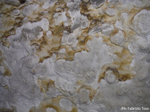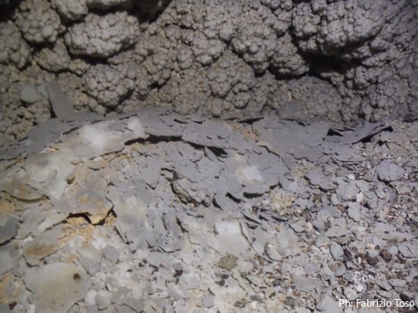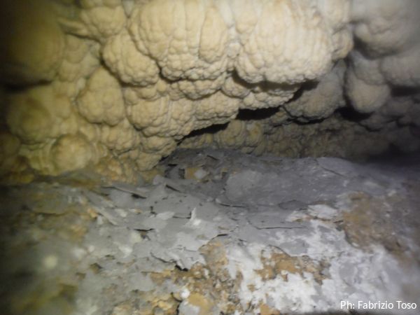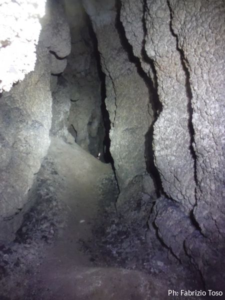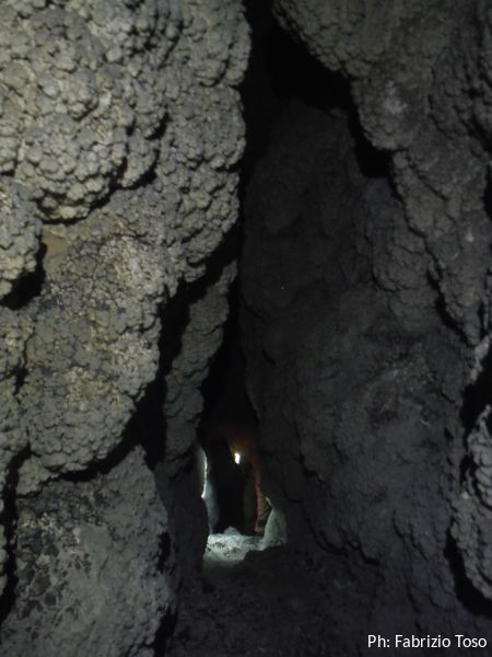 Proviamo in un punto in cui le pareti sono consumate, come dal passaggio di una corrente d’aria in qualche maniera corrosiva.