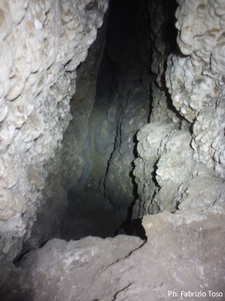 Giuseppe termina le sue ricerche dell’aria con un nulla di fatto. Lo aiuto io finendo di raccontare quel che so della grotta. Visto che per lui e’ la prima visita, gli propongo di andare a vedere per primo il ramo di sinistra, quello senza correnti d’aria. Va bene, si va.