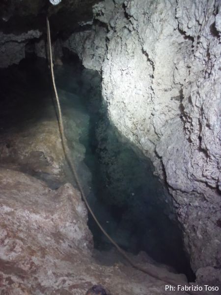 Sceso dal masso, cerco il punto dove ritornare all’acqua. Giro la testa per un poco poi individuo il passaggio. Prima di calarmi urlo per chiamare Giuseppe, mi risponde prima lui poi una voce femminile. Sono interdetto, quello sciupafemmine di Giuseppe e’ riuscito a trovare compagnia anche dentro una grotta? Mistero! Non ho capito bene dove siano, pero’ sono nelle vicinanze quindi non dubito che ci ritroveremo. Scendo e mi ritrovo all’acqua. Sorrido ancora al pensiero di non essermi dovuto bagnare.