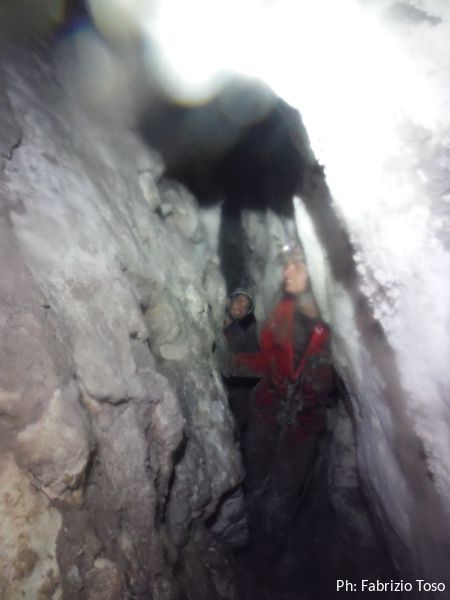 Vado avanti a vedere il passaggio che li ha fermati. Non e’ piu’ largo del tratto che abbiamo appena percorso, pero’ ora si vede che stiamo camminando nel mezzo di una alta frattura. Sotto di noi c’e’ l’acqua a circa 4 metri.