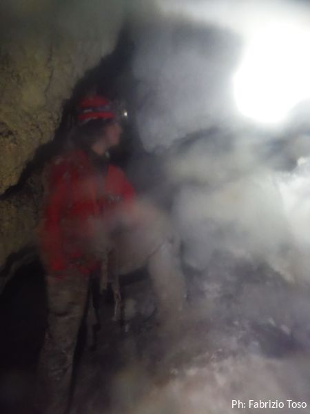 Tornati circa a meta’ strada ritroviamo l’aria, si comporta come se ora stessimo “entrando” in grotta. Probabilmente c’e’ da cercare verso l’alto, magari c’e’ un altro ingresso. Si vedra’