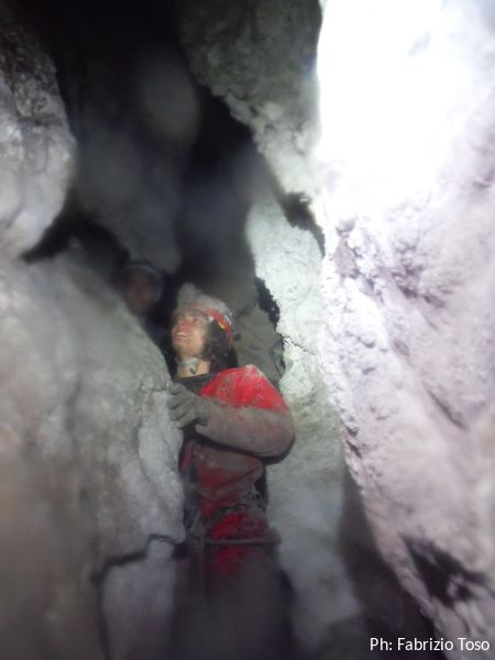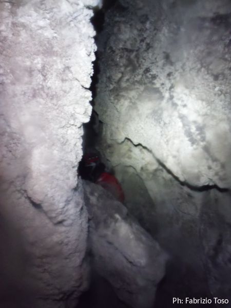 Girato l’angolo mi trovo in una sala, quasi tutta occupata da un masso gigantesco. Davanti a me ci sono delle spaccature che proseguono. Sento le voci di Giuseppe ed Arturo che girano da qualche parte. Gia’ sono contento, sono sicuramente oltre il passaggio dell’acqua, ora devo solo trovare il modo per arrivare in una zona conosciuta. Sopra di me c’e’ una spaccatura nel soffitto della sala, non e’ larghissima, ma in alcuni punti e’ percorribile. Sopra, dopo la spaccatura, sento una voce. E’ Ruggero, un altro degli amici di Vincenzo. Cerco un modo per avvicinarmi alla spaccatura. Salgo sul sassone che occupa la sala. Lo devo fare con cautela perche ‘ ricoperto da almeno un palmo di fango semi-solido e scivolosissimo. Quando sono al piano superiore, riesco finalmente a vedere e salutare Ruggero. Ho l’impressione di averlo gia’ visto da qualche parte ma questa e’ una cosa che mi riprometto di capire in seguito. Ruggero ha una corda con se’, sara’ utile per farmi sicura mentre salgo a raggiungerlo. Con la sua assistenza cerco un punto dove la spaccatura e’ abbastanza larga da permettermi il passaggio. Una volta individuato il punto giusto, faccio un nodo alla corda e poi chiedo a Ruggero di agganciarcisi con la longe e di cercare un punto comodo dove puntellarsi. quando e’ pronto, metto l’altro capo della corda nel croll ed inizio la salita. Non e’ semplice, per la prima parte della salita ho i piedi che vanno nel vuoto, devo tirarmi su a braccia. Anche se si tratta di pochi centimetri, li sento tutti. Nonostante tutto il fiatone che riesco ad esprimere, in un paio di minuti sono a salutare Ruggero. Riconosco il posto e’ “l’altopiano” dove la volta scorsa abbiamo fatto pausa sigaretta con Livia. Poco piu’ a destra infatti ritrovo il punto dove volevo armare un pozzo per evitare arrampicate nel fango.