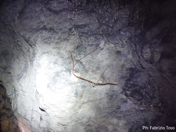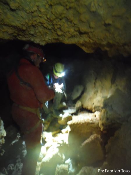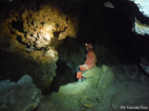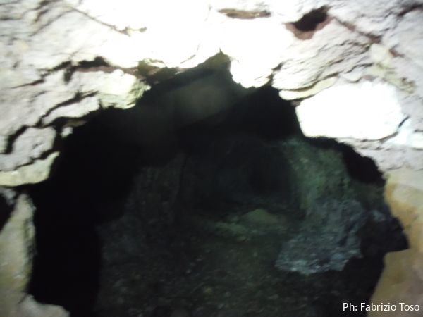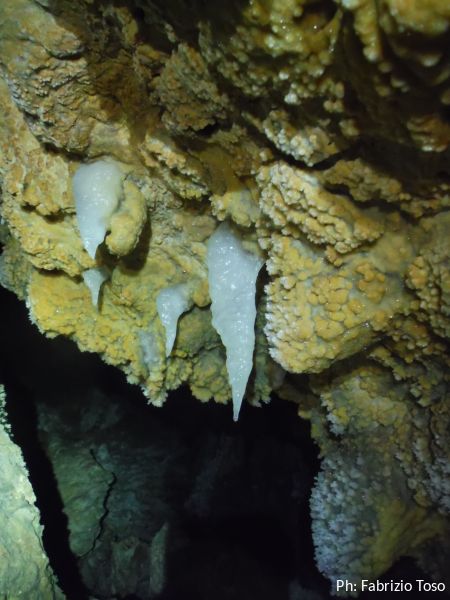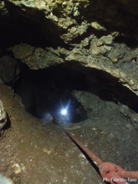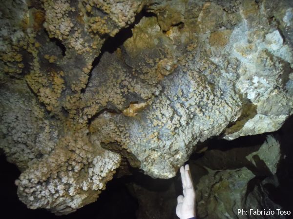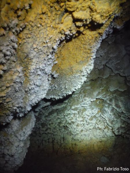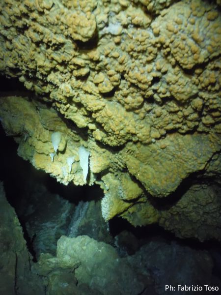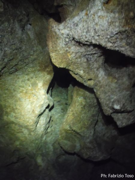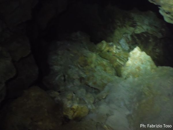 Per terra ci sono massi di crollo e sulle pareti broccoletti color ruggine e qualche stalattite candida.
