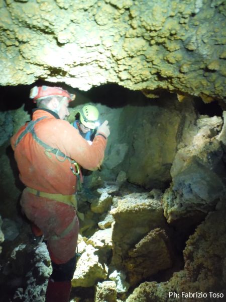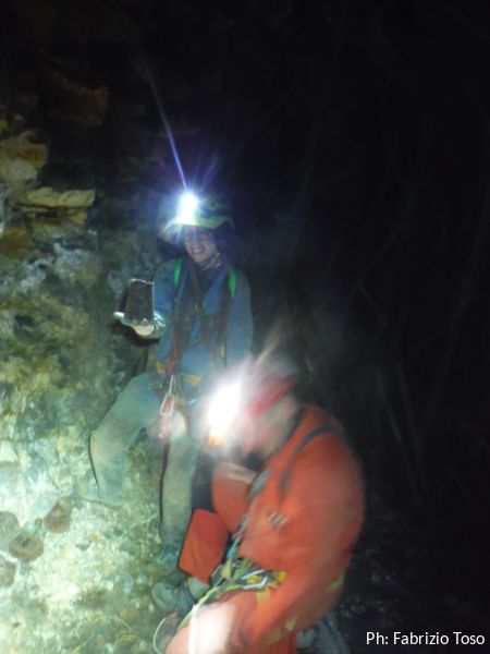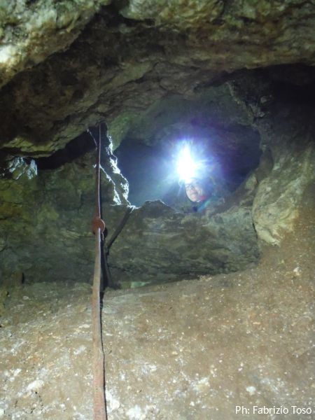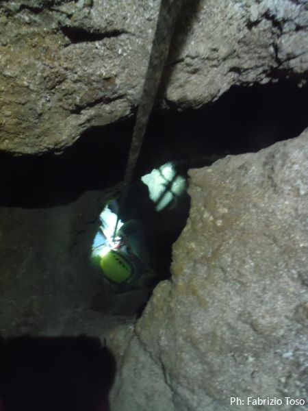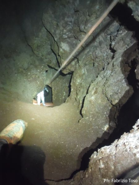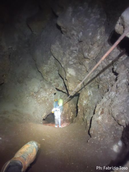 Sono all’inizio di quella che sembra un’altra sala, ancora piu’ grande della precedente. Davanti ai loro piedi, mi dice Fabrizio, c’e’ un pozzo di circa 15 metri che pero’ non sembra avere prosecuzioni, in ogni caso non potremo visitarlo poiche’ e’ disarmato.