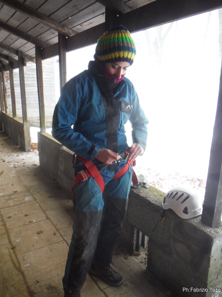 Valentina e’ meno violenta e posso importunarla fotograficamente senza tema di ripercussioni lesive per il mio fisico. In questo momento sta agganciando il delta all’imbrago facendo finta di fare fatica come se le stesse stretto. Tanto per non far sfigurare noi, che la fatica la facciamo sul serio.
