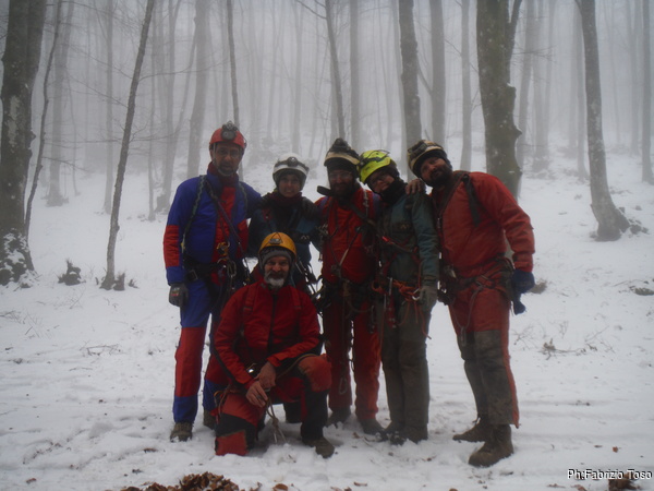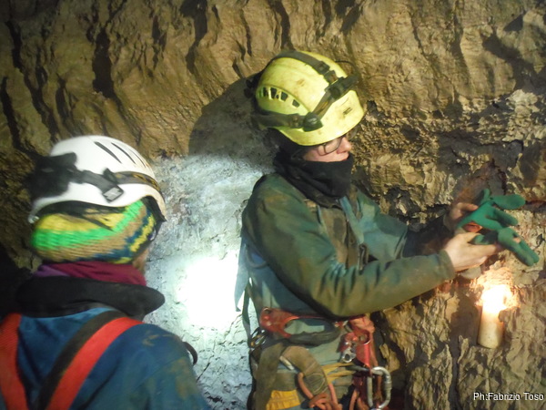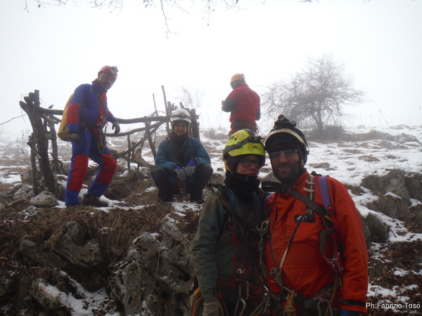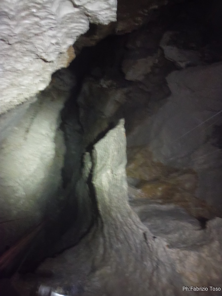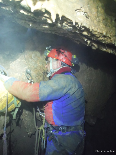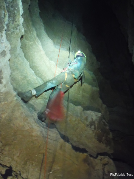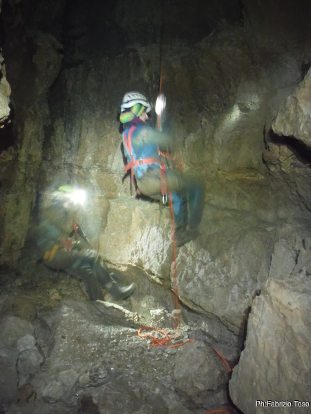 Ripongo la fotocamera e metto mano al trapano. C’e’ parecchio da fare e dobbiamo sbrigarci. Il resto del gruppo e’ andato a fare una veloce visita al presepe allestito da Maurizio all’inizio dell’altro ramo, ma a breve saranno qua e non vogliamo che debbano rimanere troppo fermi. Parto dal traverso, mi sistemo a destra della via gia’ armata e metto i fix per la partenza. Gabriele nel frattempo mi raggiunge cosi’ scendiamo assieme. Al terrazzino di meta’ pozzo ci fermiamo a doppiare l’armo per entrambe le vie. Al frazionamento successivo metto un altro paio di fix, sistemo il frazionamento e ci accingiamo a scendere l’ultimo tratto. Appena in tempo, e’ gia’ qualche minuto che da sopra sentiamo rumori prodotti dai nostri amici. Ora iniziano ad urlarci per sapere a che punto siamo. Scendiamo svelti l’ultimo tratto e diamo la libera.