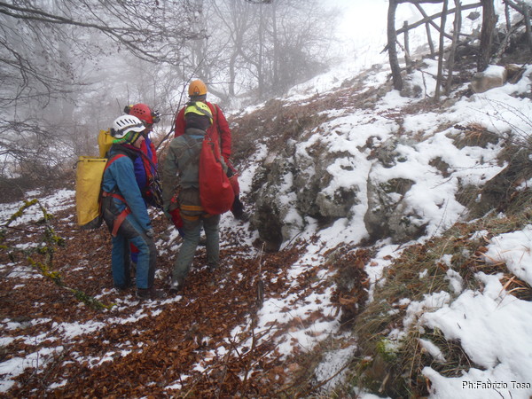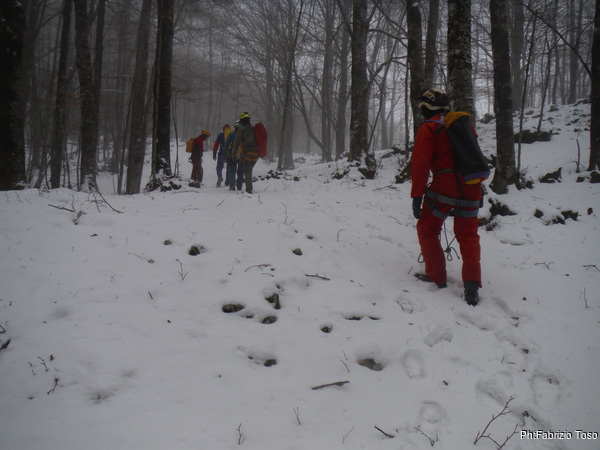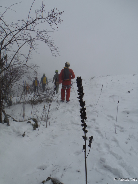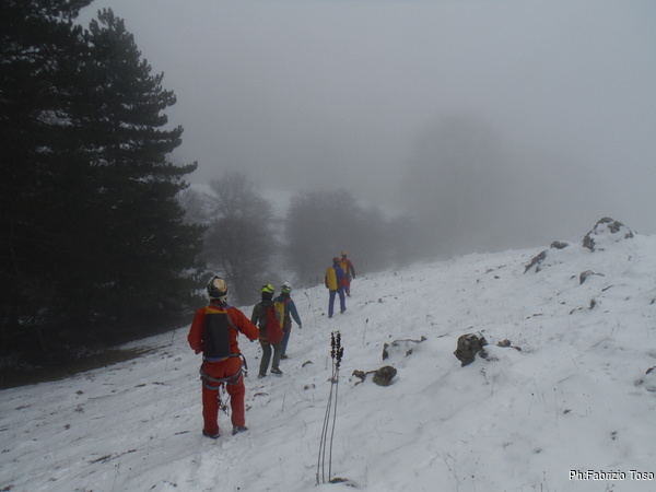 Faccio un poco fatica a riconoscere il sentiero, pero’ la sicura guida di Maurizio ci porta fino a svalicare nel punto giusto ed iniziare la discesa che porta alla grotta.