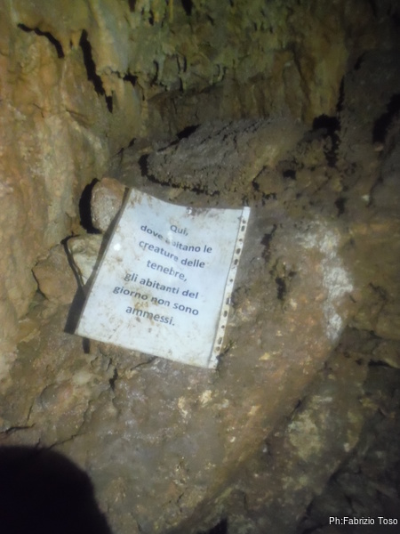 Il programma e’ quello di scendere per il ramo “parallelo” armando una seconda via sul pozzo lungo, un P50 circa. Sembra che nessuno abbia particolare voglia di andare avanti ad armare. Gabriele ed io ci facciamo forza, prendiamo il materiale necessario ed entriamo per primi. Nella prima saletta ci sono ancora i fogli con i moniti della grotta.